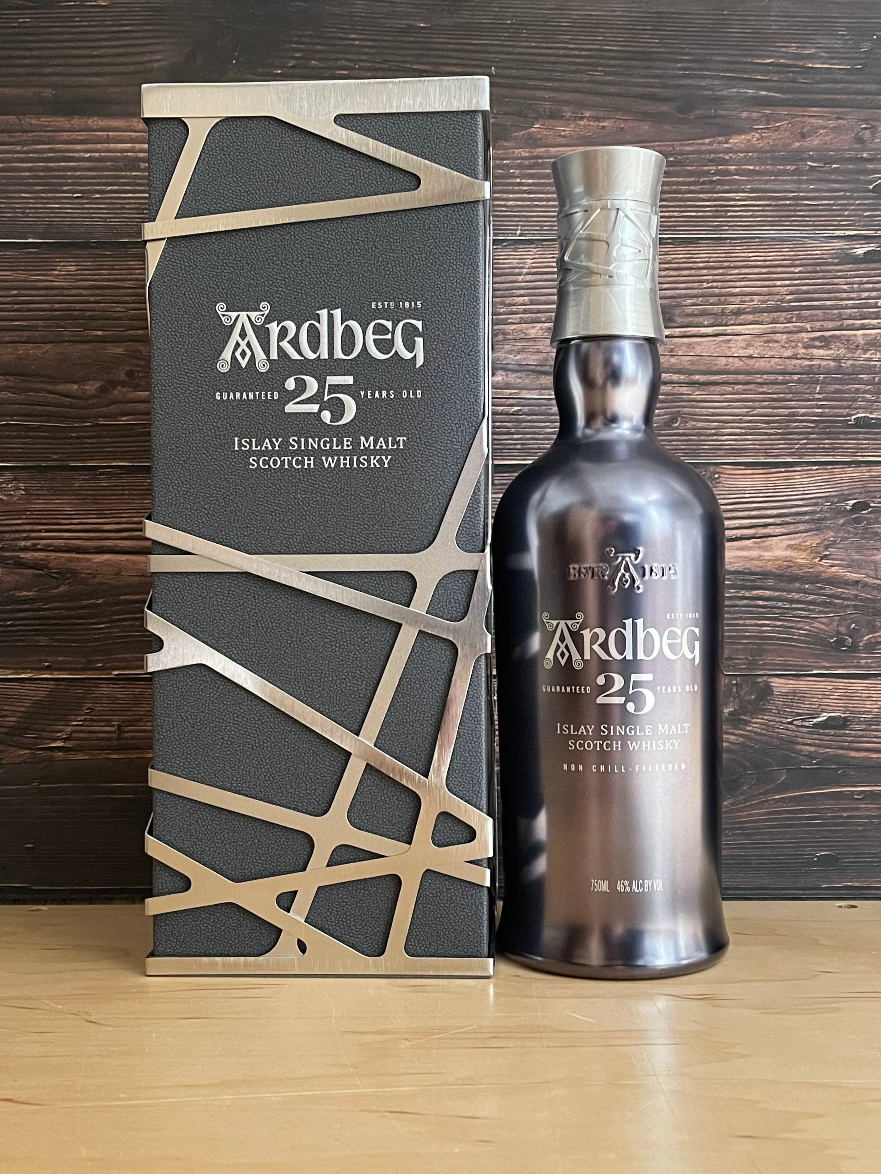 Ardbeg Aged 25 Yrs Islay Single Malt Scotch Whiskey. In an age of Whisky start-ups, Ardbeg is refreshing blast from the past. They have been making Malt Whisky on the same site since 1798. The product was so popular that they ramped up production to commercial levels in 1815.