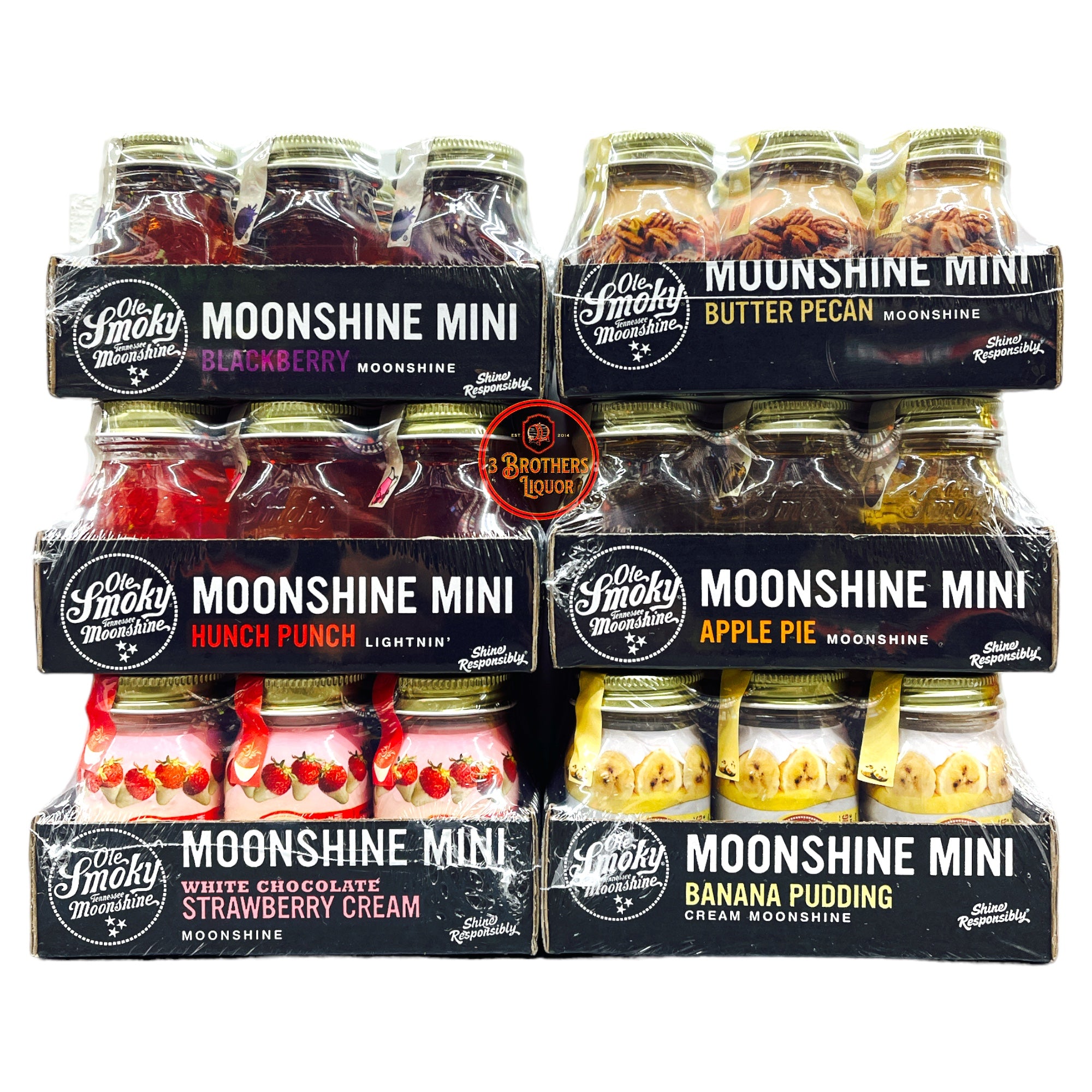 Ole Smoky Moonshine Mini Shots 36Pk 50ML Bundle Set. Includes a 6pk bundle of each. Hunch Punch, Blackberry, Butter Pecan, Apple Pie, White Chocolate Strawberry Cream, Banana Pudding.