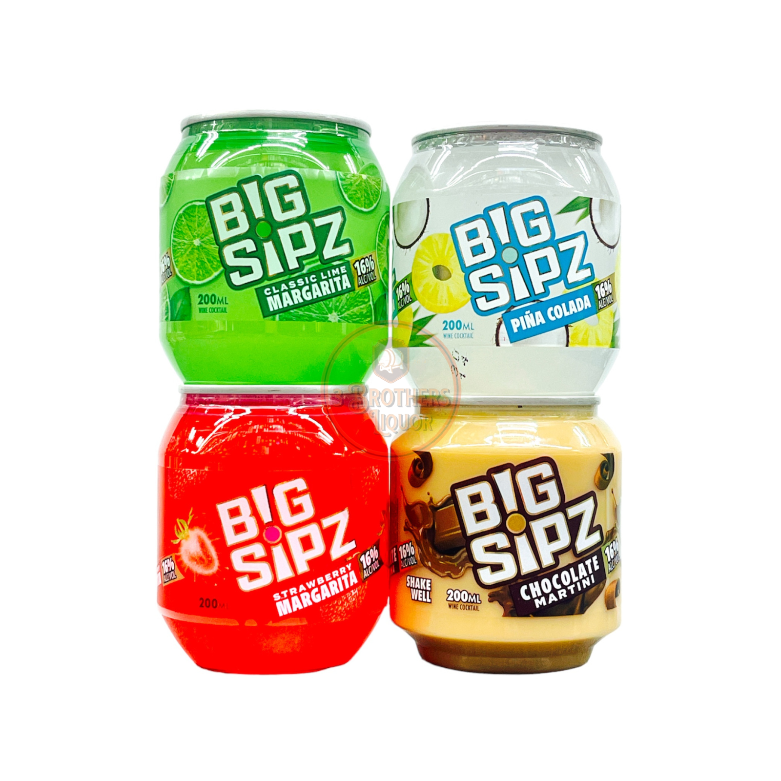 Introducing Big Sipz - delicious cocktails ready in a can. This 4-pack bundle includes an assortment of classic and premium flavors, so you can try them all. With no ice, mixing, or stirring required, each drink is ready to sip in minutes.