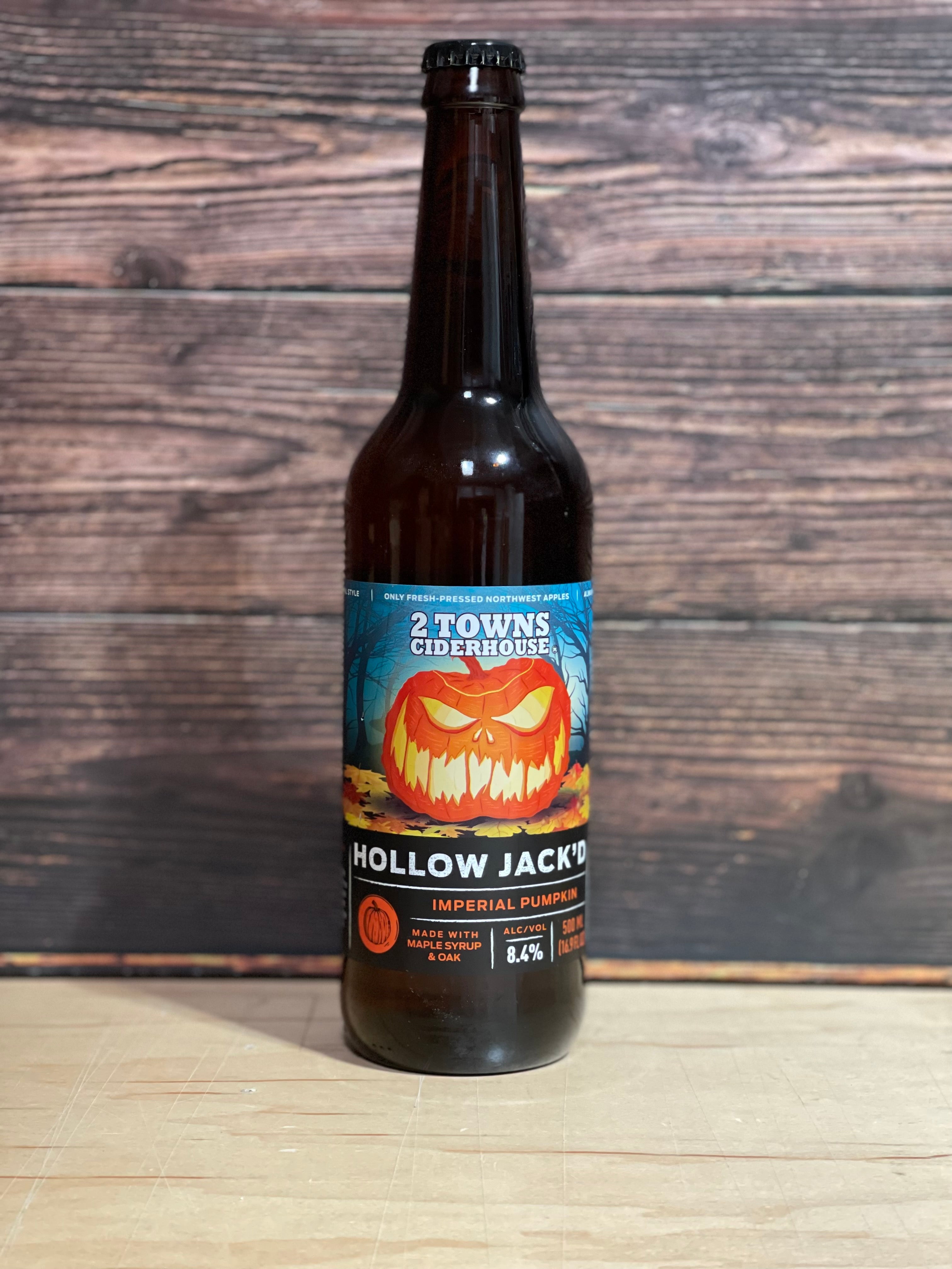 2 Towns Ciderhouse Hallow Jack’D Imperial Pumpkin (Limited Release). Mischievous & spiced, Hollow Jack is far from empty. A brew of fresh-pressed apples, caramelized pumpkin and sweet potatoes is finished with a dash of honey and spices to carve out this special Fall cider.