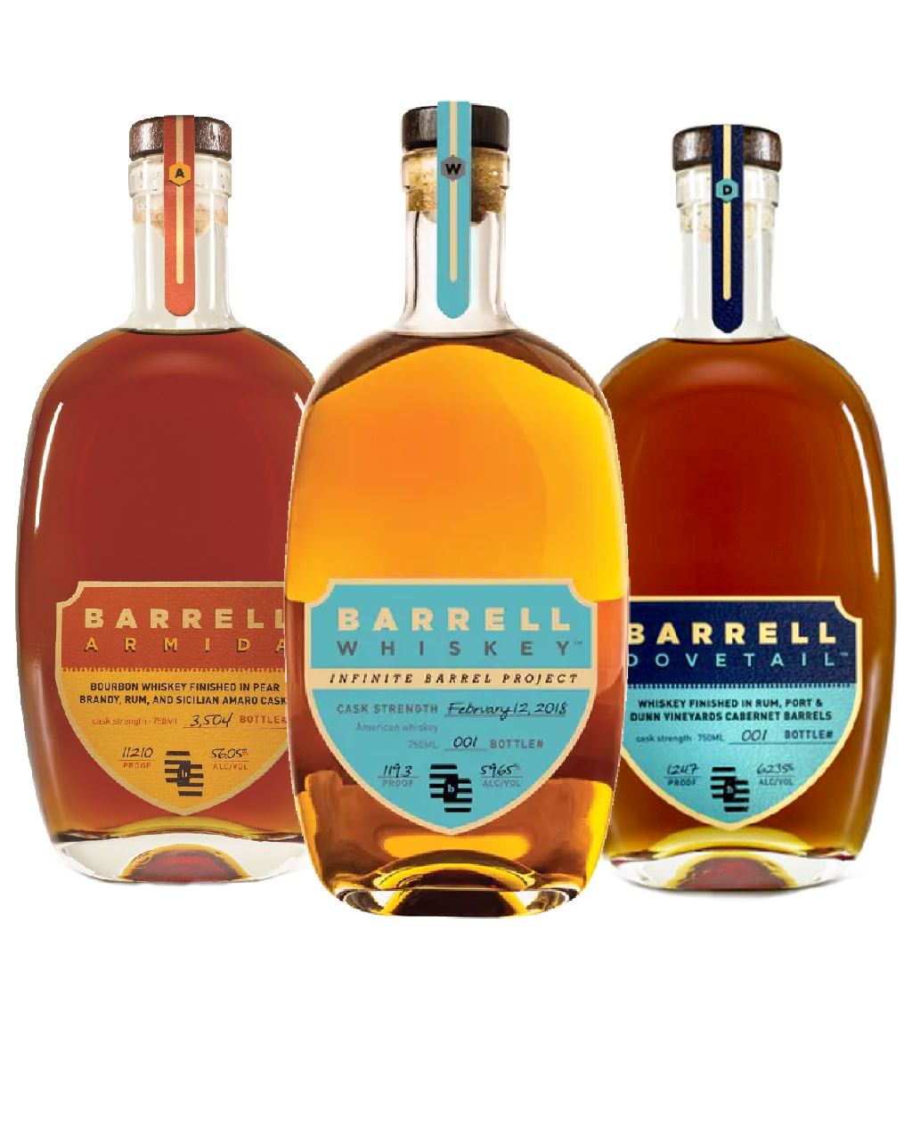 Barrell Craft Spirits Whiskey Combo (Armida, Infinite Barrel Project, Dovetail) Armida is a marriage of bourbon whiskeys finished separately in rum, pear brandy, and Sicilian Amaro casks. Barrell Craft Infinite Barrel Project: Infinite Barrel Project is a constantly evolving whiskey that is different with each bottling date. Barrell Craft Dovetail: Dovetail is blended to highlight some of our favorite flavors. Woody bourbon; terroir driven Dunn Cabernet; toasted French oak.