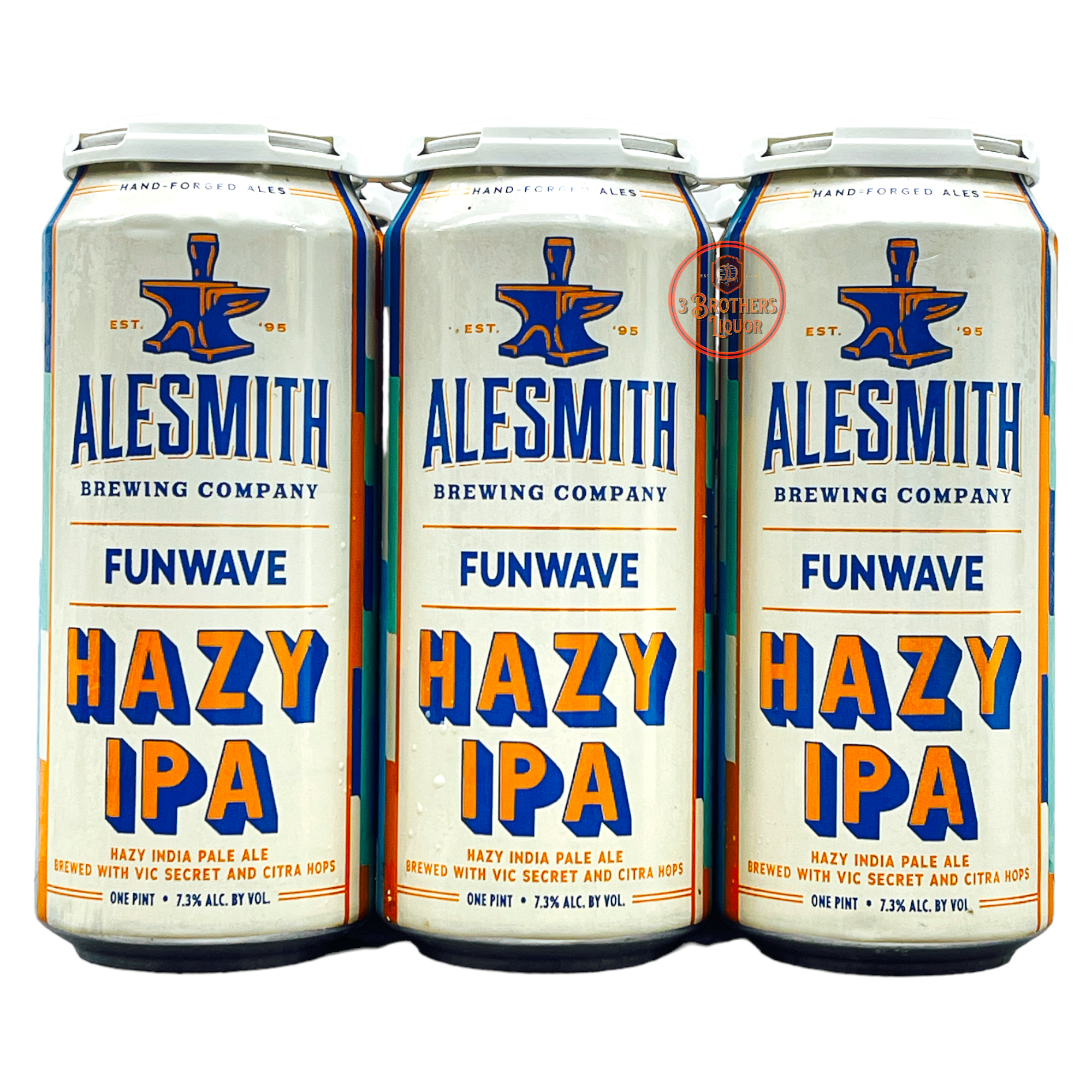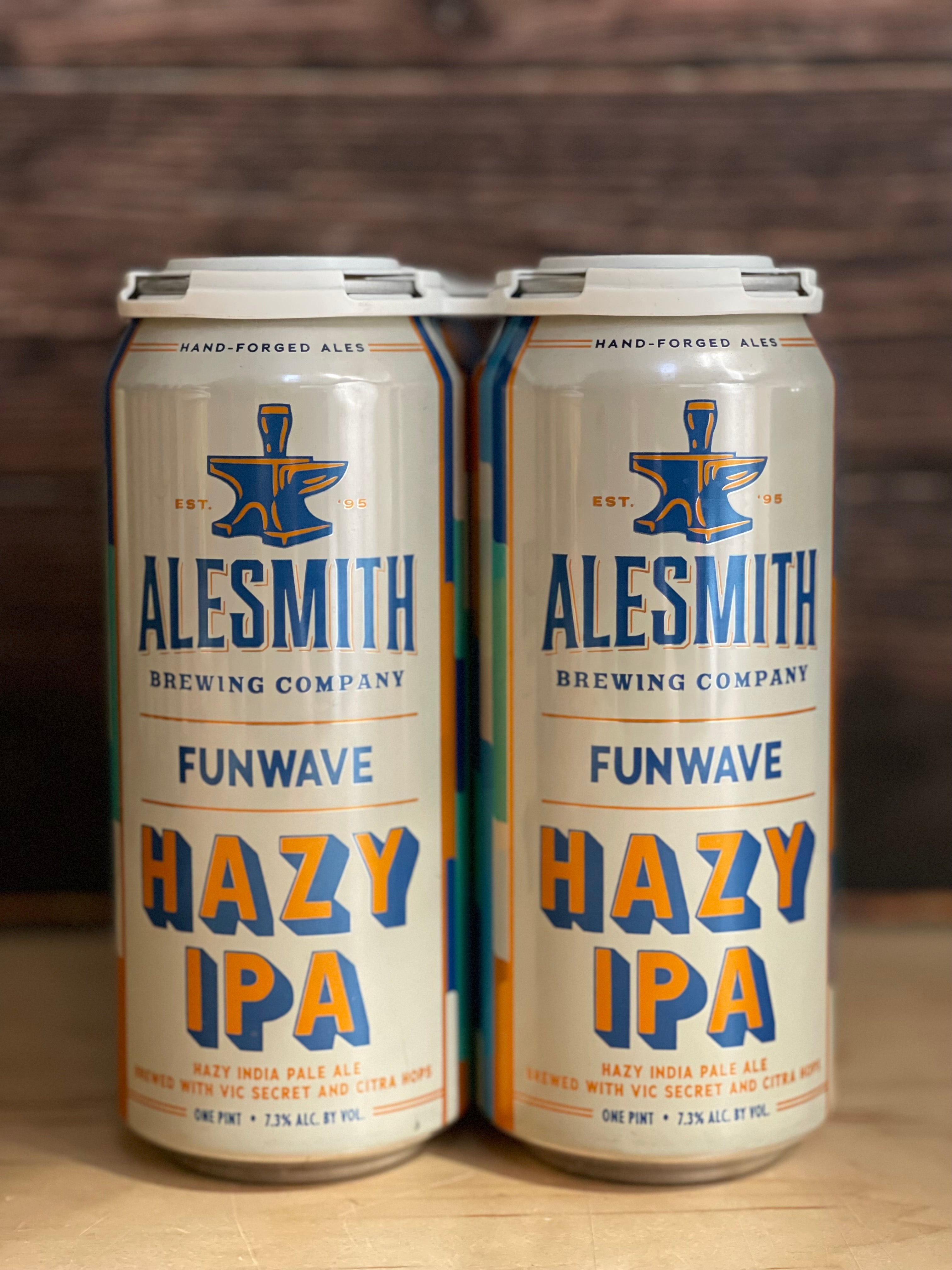 Alesmith Brewing Funwave Hazy IPA. Funwave is packed with bright notes of pineapple, passionfruit, and mango from massive amoutns of vic secret and citra hop additions. This beer's tropical aromas instantly whisks you away on a fun-tastic voyage through hints of citrus. Remind your tastebuds to pack their bags as you're about to ride the wave of flavor!