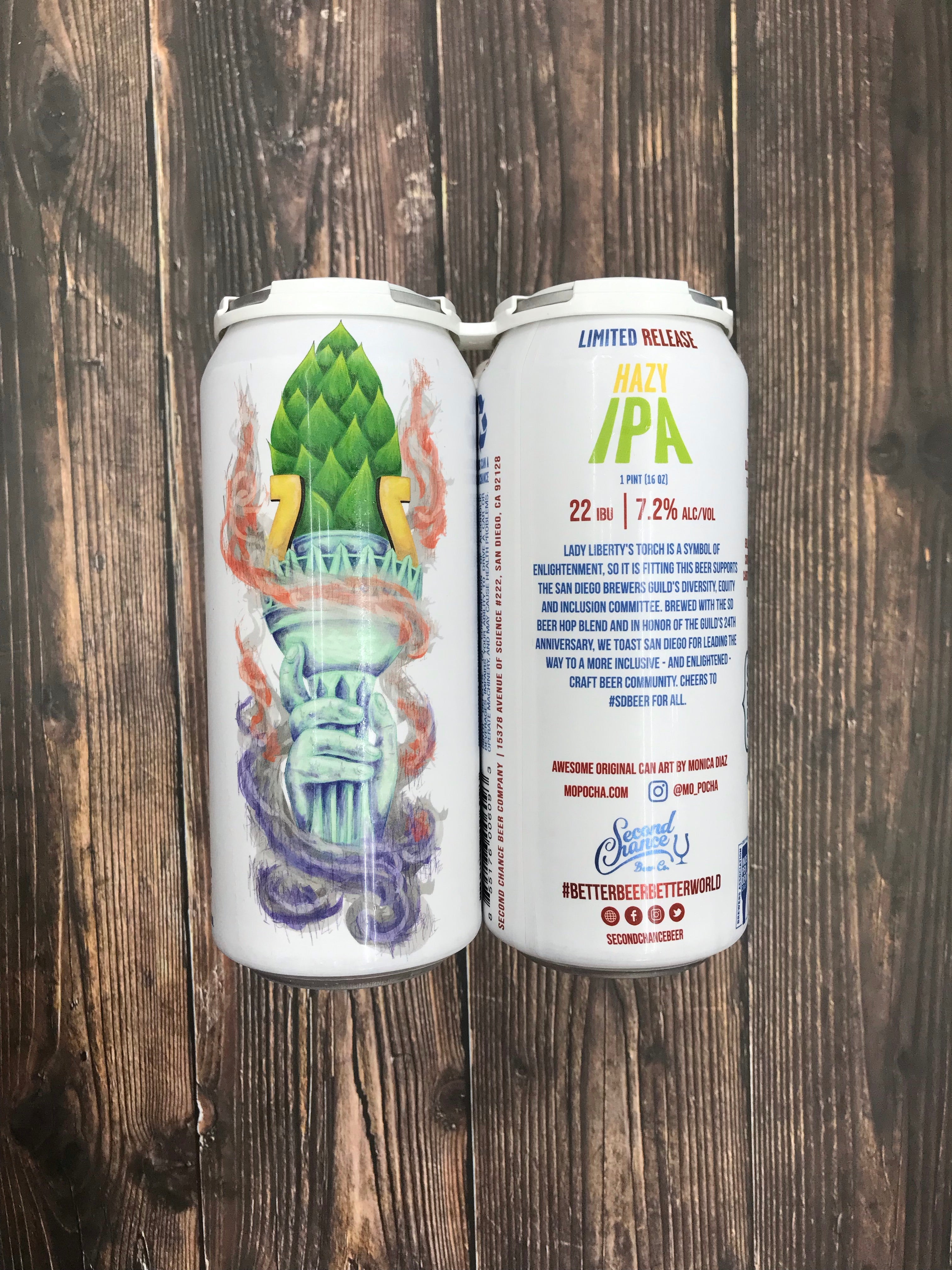 Second Chance “Lady Liberty” Hazy IPA With citrus, passionfruit, and blueberry aromatics, this Hazy IPA is a full-bodied grapefruit and papaya juice-bomb that has a soft mouthfeel and slightly creamy finish. Though heavily balanced towards the hop profile in aromatics, bitterness is subtle.