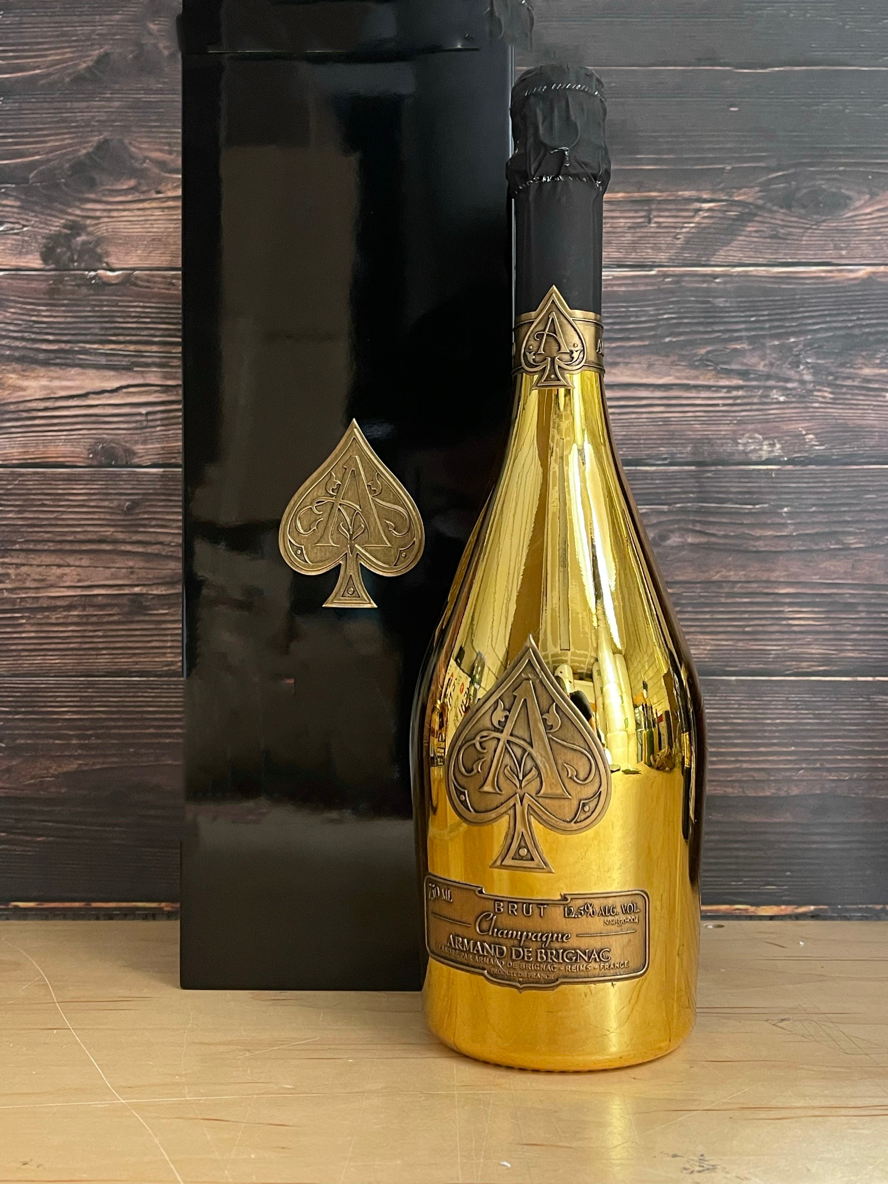 Armand De Brignac Brut Gold Ace Of Spades Champagne W/ Wooden Gift Box. The first release from Armand de Brignac, the Brut Gold remains the most iconic cuvée in the range. Rich with the old world traditions of champagne blending, it is a trio of vintages from some of the most lauded terroirs in the region, resulting in a prestige cuvée that expresses vibrant fresh fruit character, and layers of complexity.