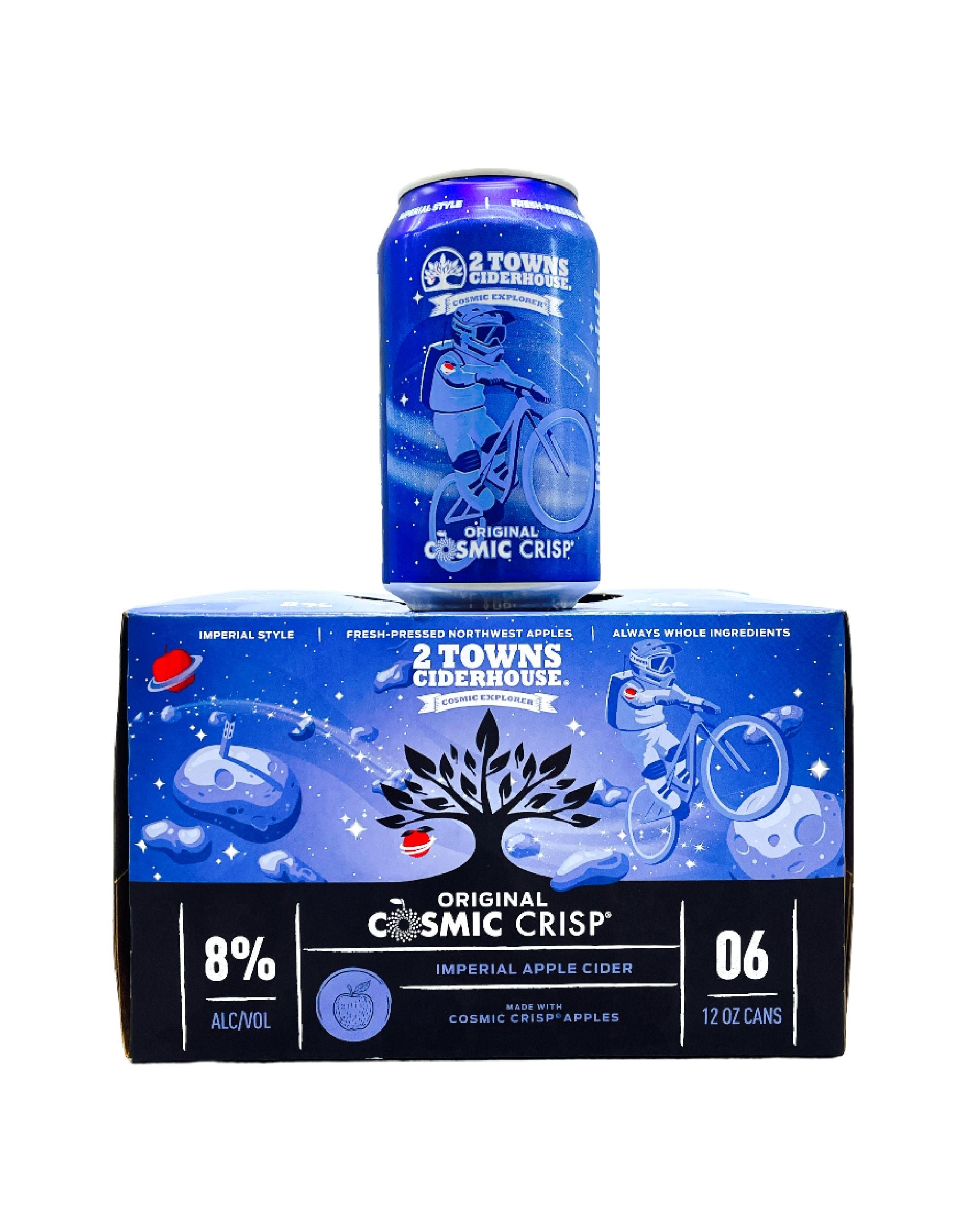 2 Towns Ciderhouse Original Cosmic Crisp Apple Cider. We’ve finally found a way to package the stars! With a bubbly visual profile that glistens and gleams like starlight and an 8% ABV, Cosmic Crisp® is sure to take you on an interstellar cider experience.