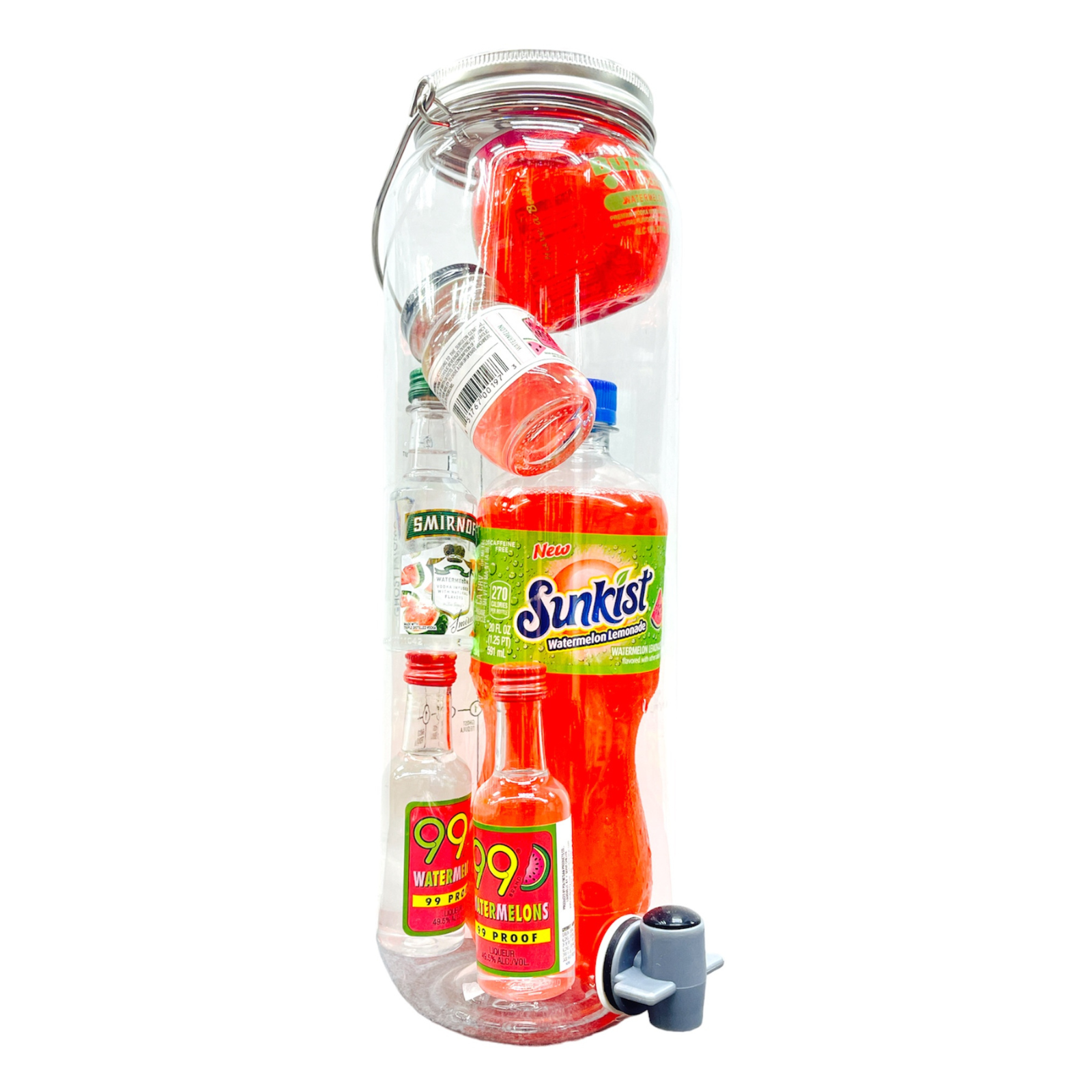Enjoy an explosion of sweet watermelon flavor with this 3 Brothers Liquor Chug Jug Watermelon Burst Mix Cocktail. It contains 16oz of Sunkist Watermelon Lemonade, 50ML of 99 Brand Watermelon Liqueur, 50ML of Smirnoff Watermelon Vodka, 50ML of Midnight Moonshine, and a 200ML of Buzzballz Watermelon Smash Cocktail. Crafted for a smooth and satisfying taste, this mix cocktail is perfect for any celebration.