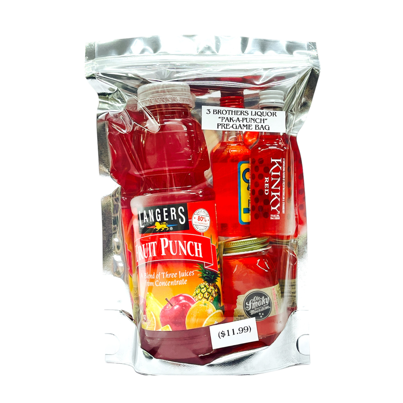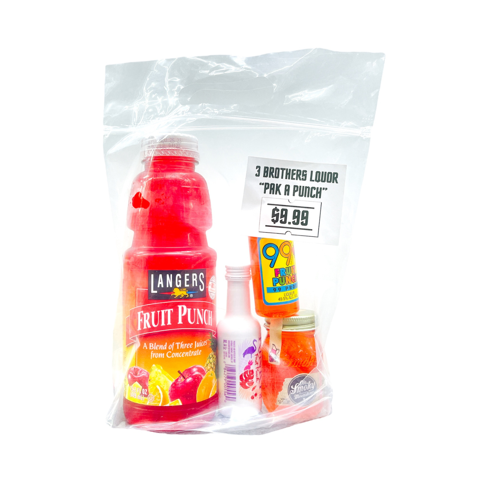 3 Brothers Liquor "Pak-A-Punch" Fruit Punch Cocktail In A Bag. TikTok Viral cocktail in bag! Contains 1x Langers fruit punch juice. 1x 50ML 99 Brand Fruit Punch Liqueur, 1x 50ML Kinky Fruit Punch Liqueur, 1x 50ML Ole Smoky Hunch Punch Moonshine.