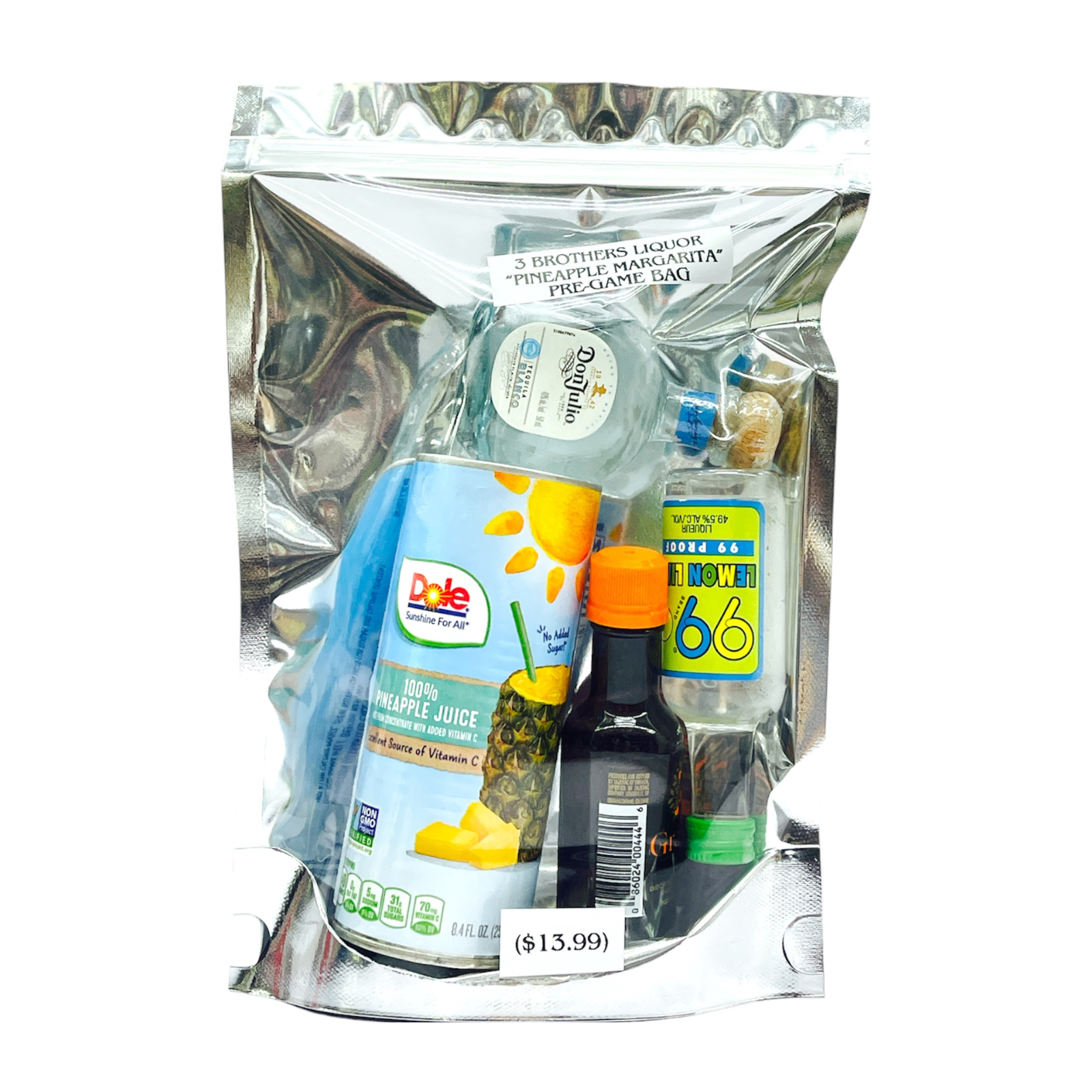 3 Brothers Liquor "Pineapple Margarita" Cocktail In A Bag. Viral TikTok cocktail in a bag! Contains 1x Dole Pineapple Juice Small Can, 1x 50ML Don Julio Blanco Tequila, 1x 50ML Gran Gala Liqueur, 1x 50ML 99 Brand Lemon Lime Liqueur.