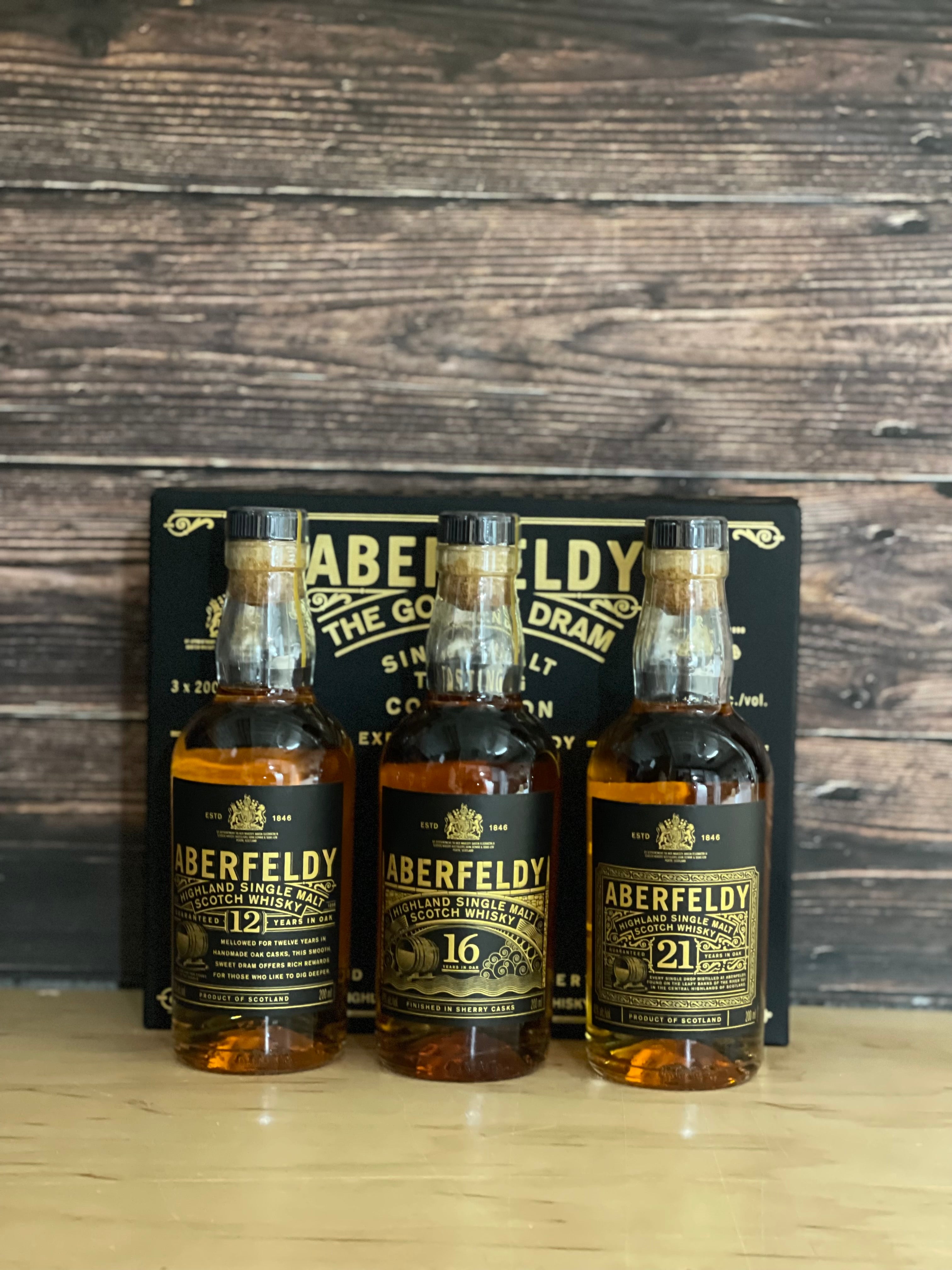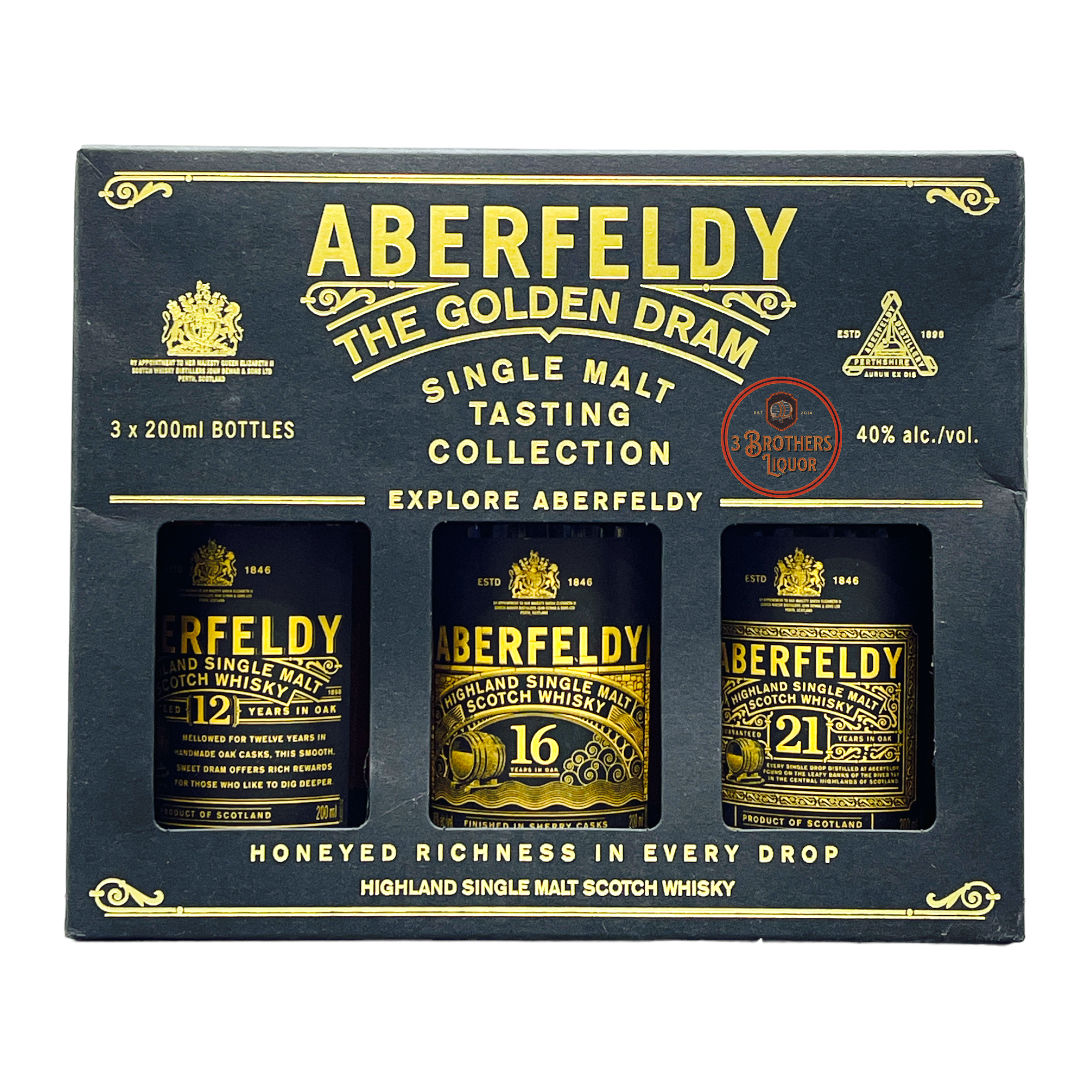Aberfeldy The Golden Dram Gift Set W/ 12 Yr, 16 Yr, 21Yr Scotch Whiskey. ABERFELDY, also know as 'The Golden Dram', has the classic house style of a Highland Single Malt Scotch Whisky. Honeyed richness in every drop, with a complex yet approachable taste. A dram best savoured and enjoyed with friends.