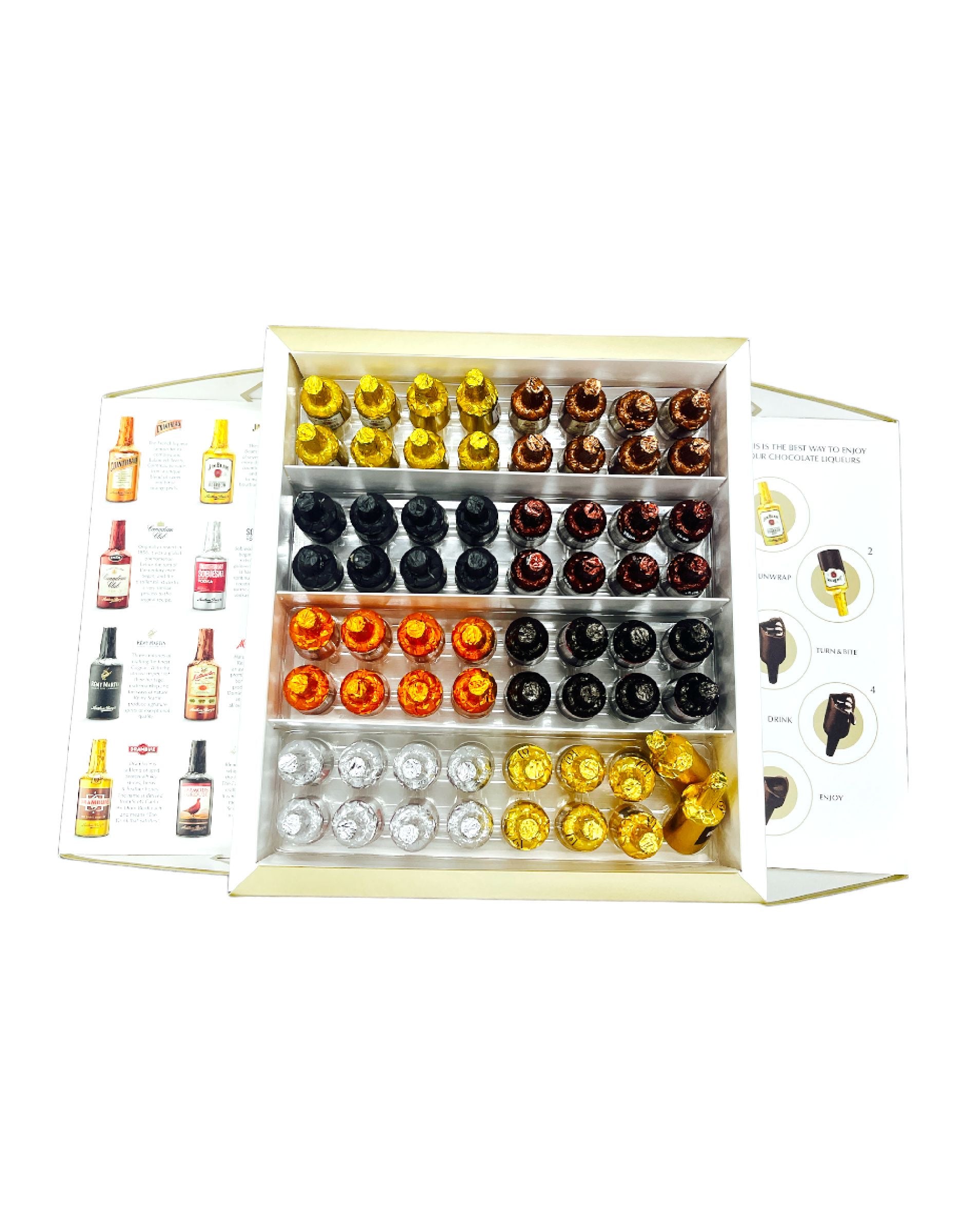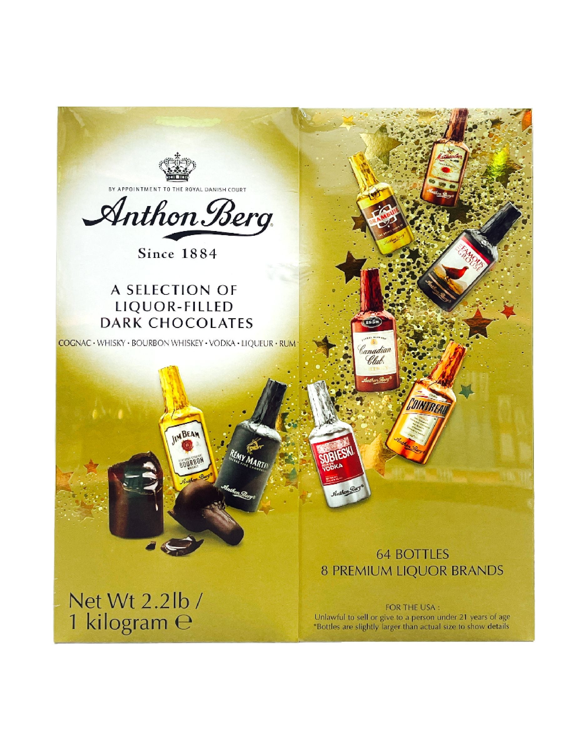 Anthony Berg A Selection Of Liquor-FIlled Dark Chocolates Gift Set. Chocolate lovers love the quality confections created by Anthon Berg. These chocolate bottles are filled with some of the world’s finest liqueurs—each carefully selected to complement Athon Berg’s fine dark chocolate. Each bottle is wrapped in a foil label to replicate the original bottle.