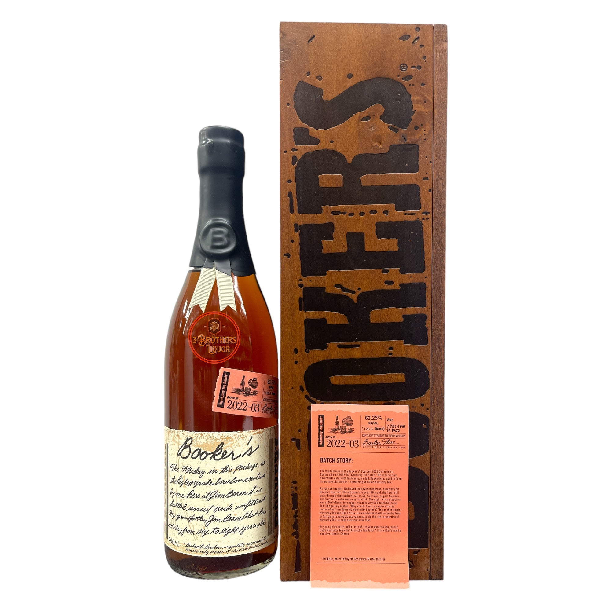 Booker's Kentucky Tea Batch 2022-03 Kentucky Bourbon Whiskey. This bourbon is made using a blend of carefully selected barrels, each of which has been aged to perfection. The resulting whisky is full-bodied and complex, ..