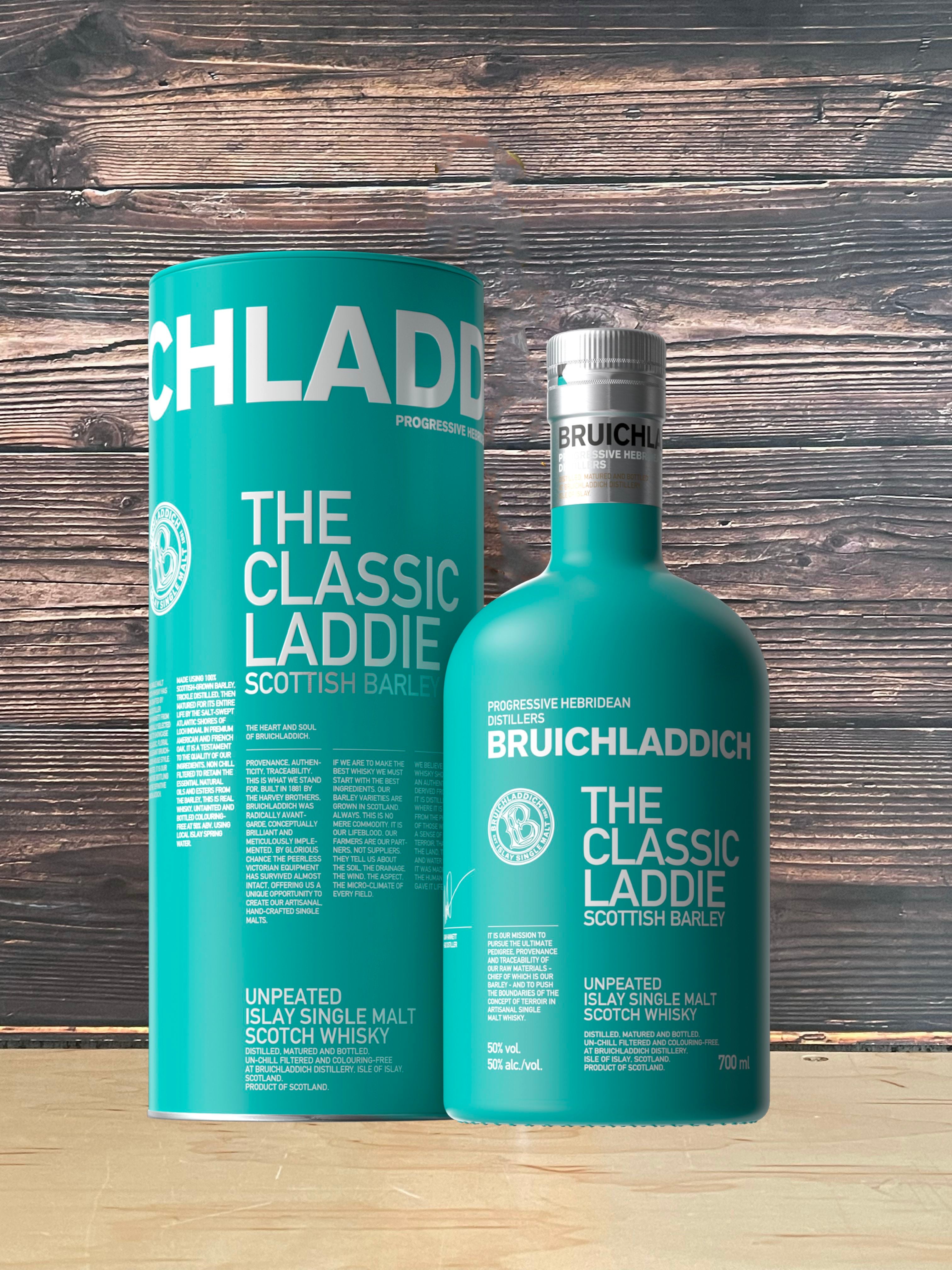 Bruichladdich The Classic Laddie Islay Single Malt Scotch Whisky. Jim has now retired but the spirit for this definitive Bruichladdich is still made from 100% Scottish barley, trickle distilled, and then matured for its entire life, on Islay, by the shores of Loch Indaal. Each vatting of this classic multi-vintage cuvee is now carefully assembled from a suite of individual casks by our Head Distiller Adam Hannett.