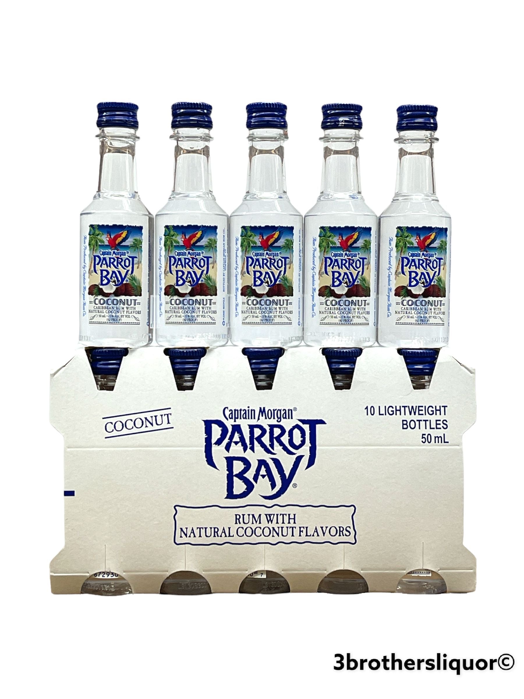 Captain Morgan Parrot Bay Coconut Rum Mini Shots (10 Pack Of 50ML). Parrot Bay is a premium merge of fresh, rich flavors with a light, crisp rum. This rum is designed to envelop your senses and transport you to your own pitstop in paradise.
