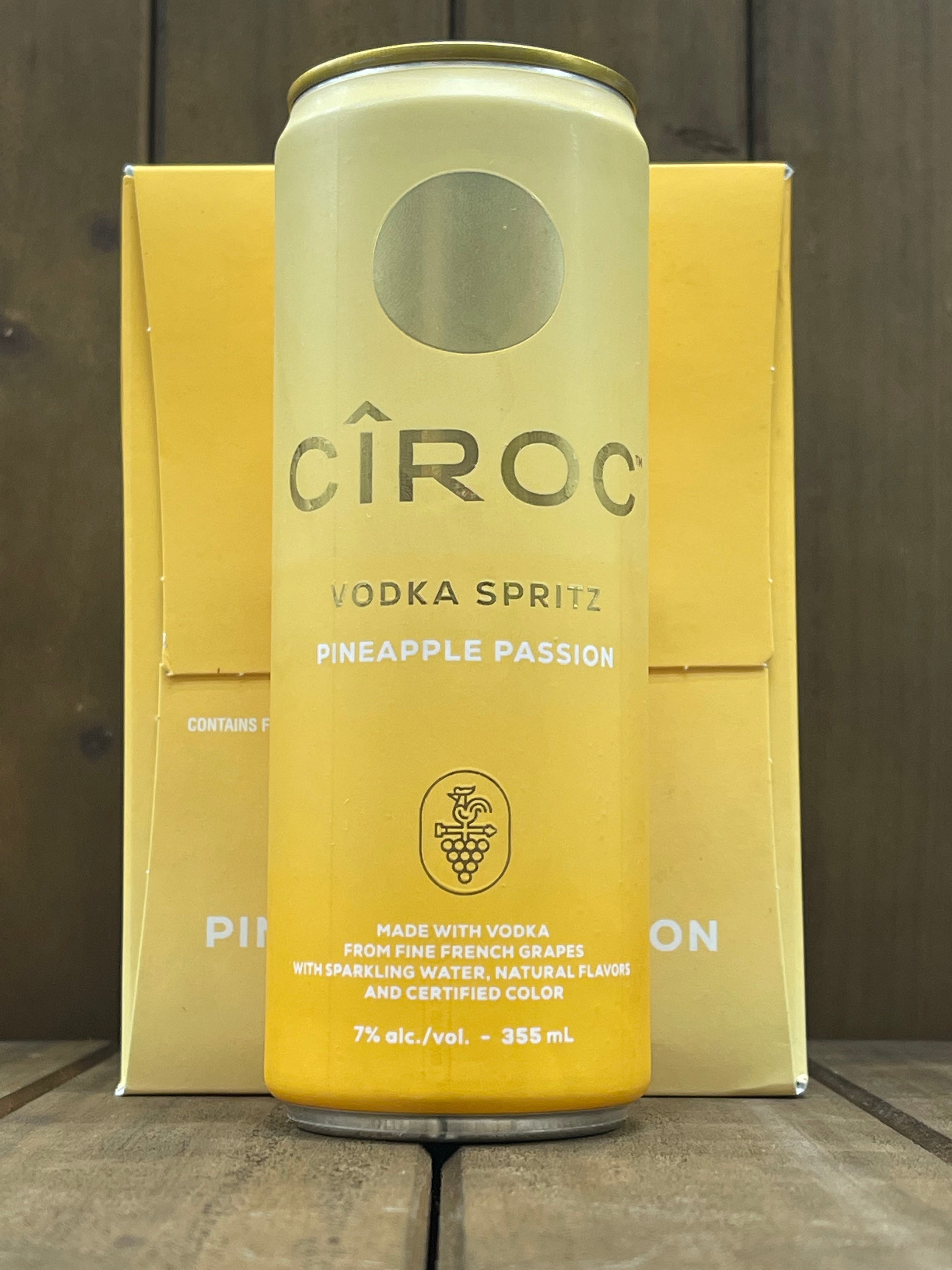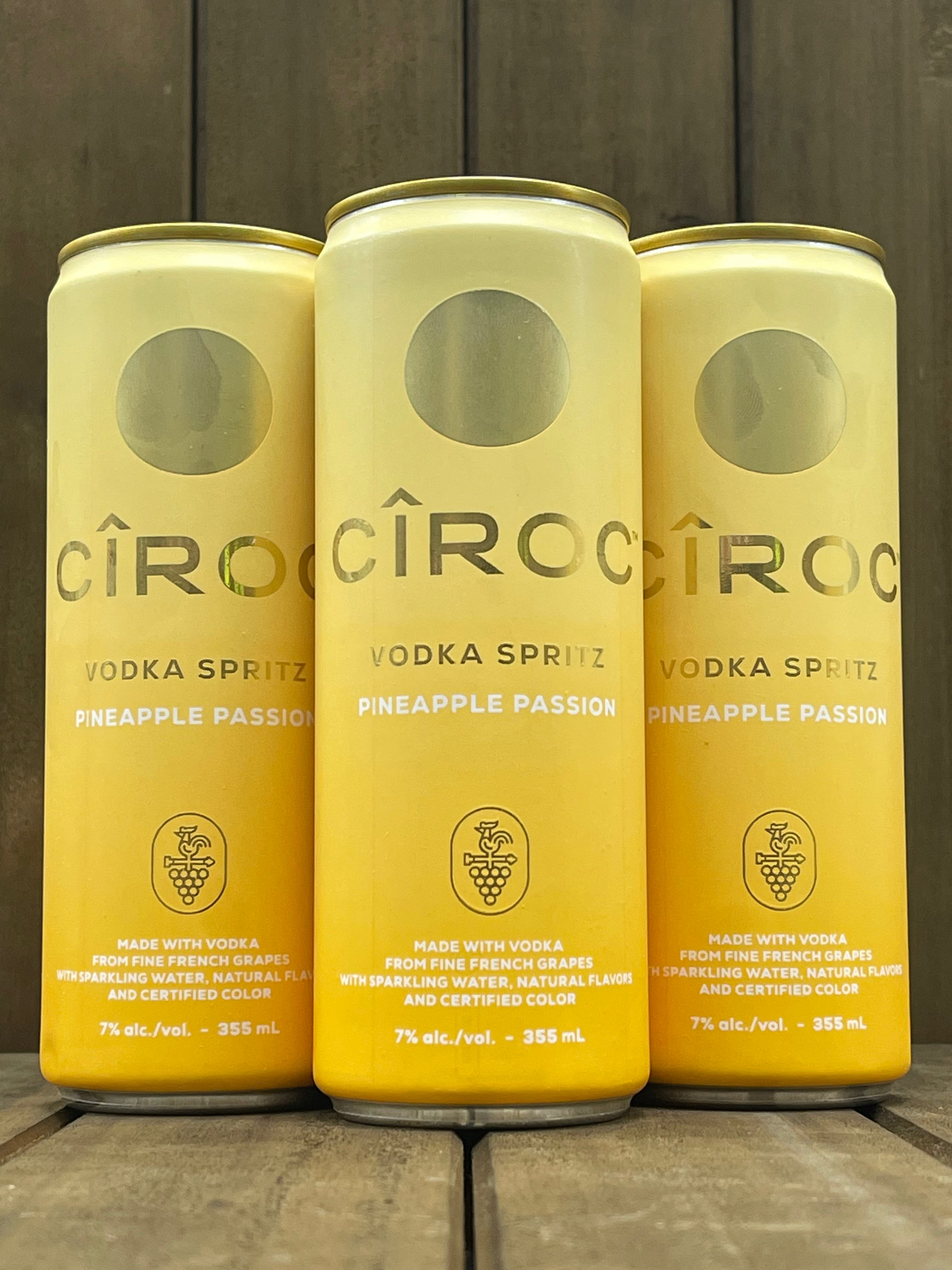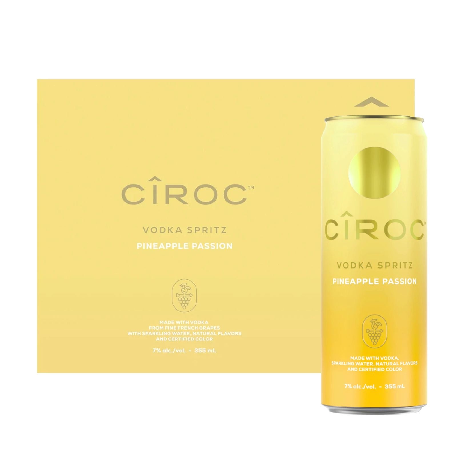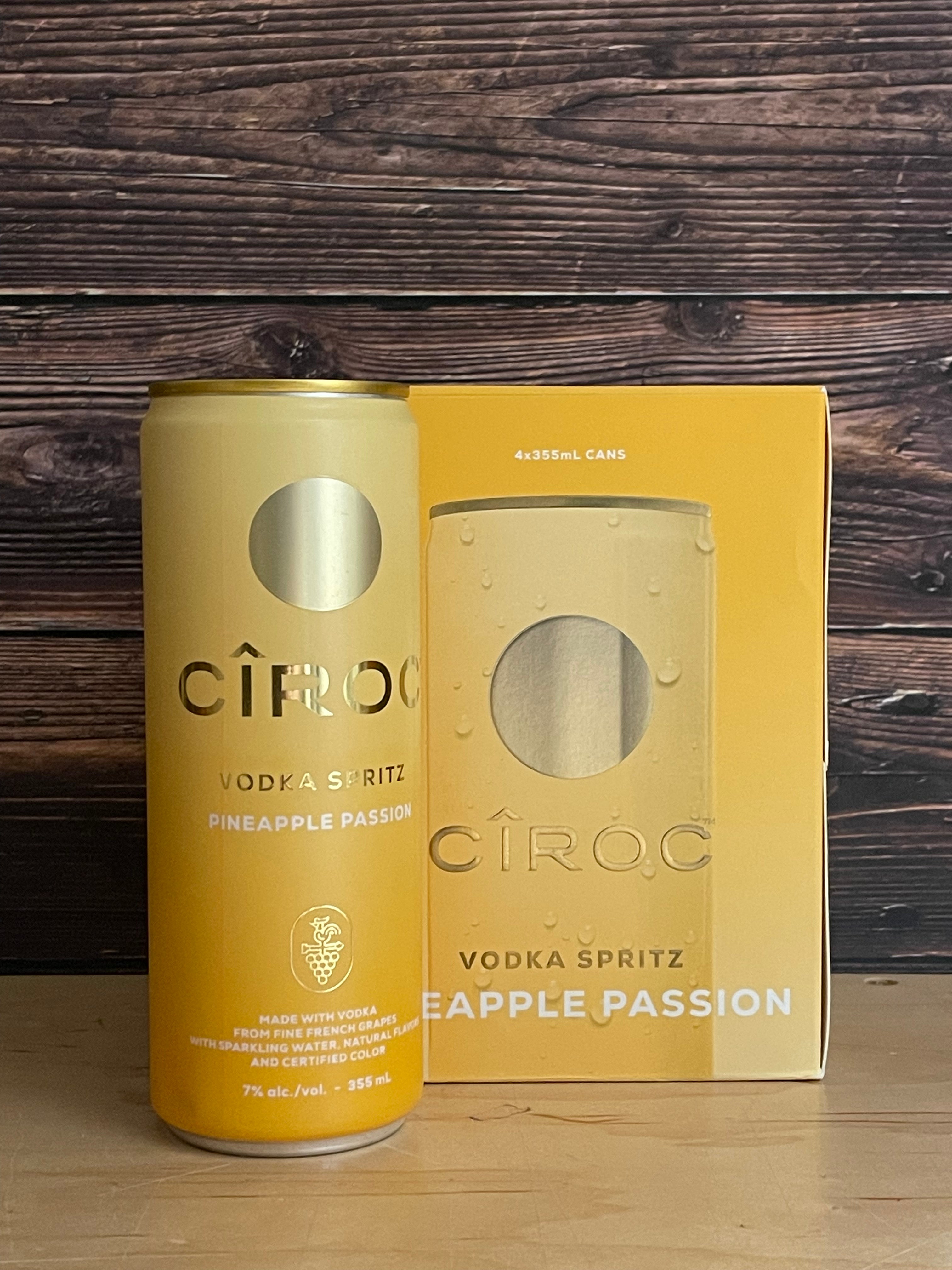 Ciroc Pineapple Passion Vodka Spritz 4PK Cans (2022 Release). Ciroc Vodka Spritz Pineapple Passion is made with vodka from fine French Grapes with sparkling water and natural flavors. Gluten-Free. 7% ABV Per Can. 355mL Cans.