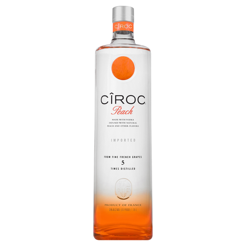 CIROC Peach is a rich tasting spirit made with vodka distilled five times from fine French grapes, finished in a tailor-made copper pot still in Southern France. This spirit is masterfully infused with a distinctive blend of peach and other natural flavors, resulting in a taste experience that is lusciously different and elegantly smooth. Simply mix with champagne for a delicate Peach Bellini cocktail. Includes one 70 proof 1.75 L bottle of CIROC Peach. Born from generations of winemakers and distillers dating back to the 15th century, Jean-Sebastien Robicquet, the Master Distiller of CIROC, carries the art of distilling in his veins and is based in France in the renowned wine region of Bordeaux. Our spirits are made from fine French grapes, specially selected to embody a distinctive flavor with an exceptionally fresh taste. Each blend combines the masterful art of traditional and modern distillation to bring you the finest, smoothest spirits with the most refreshing taste. Please drink responsibly., One 1.75 L bottle of CIROC Peach, Masterfully infused with peach and other natural flavors, Made with vodka distilled five times from fine French grapes, Finished in a tailor-made copper pot still in Southern France, 70 proof, Gluten-free