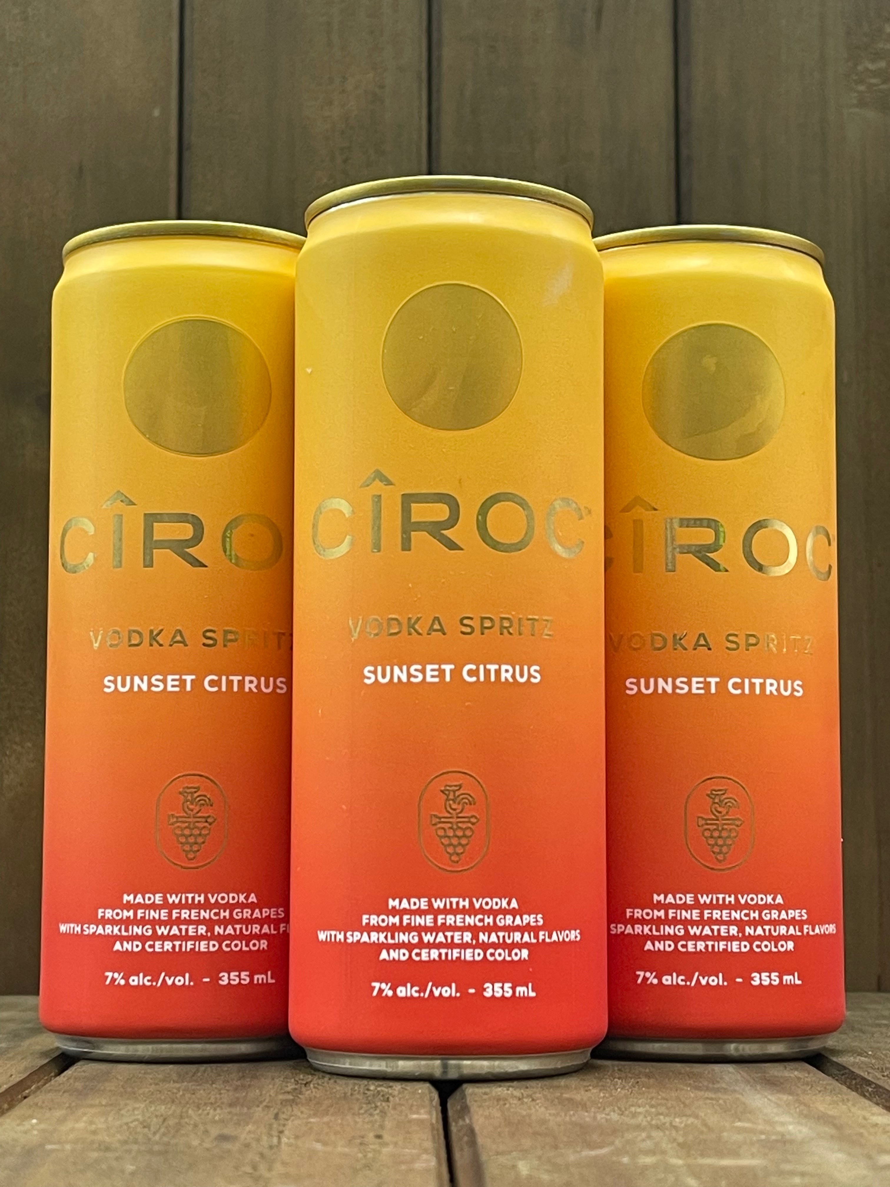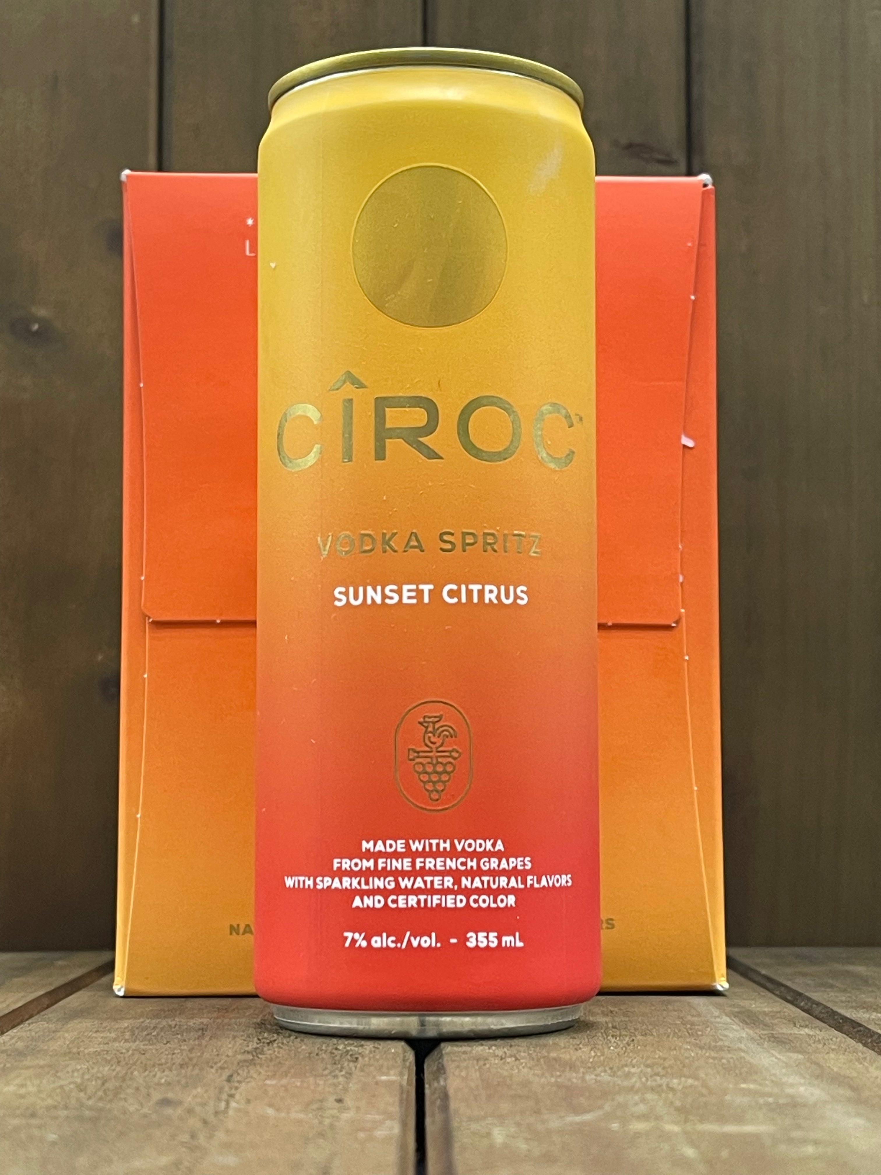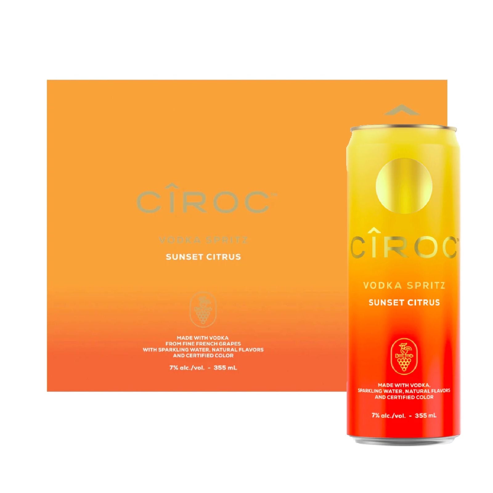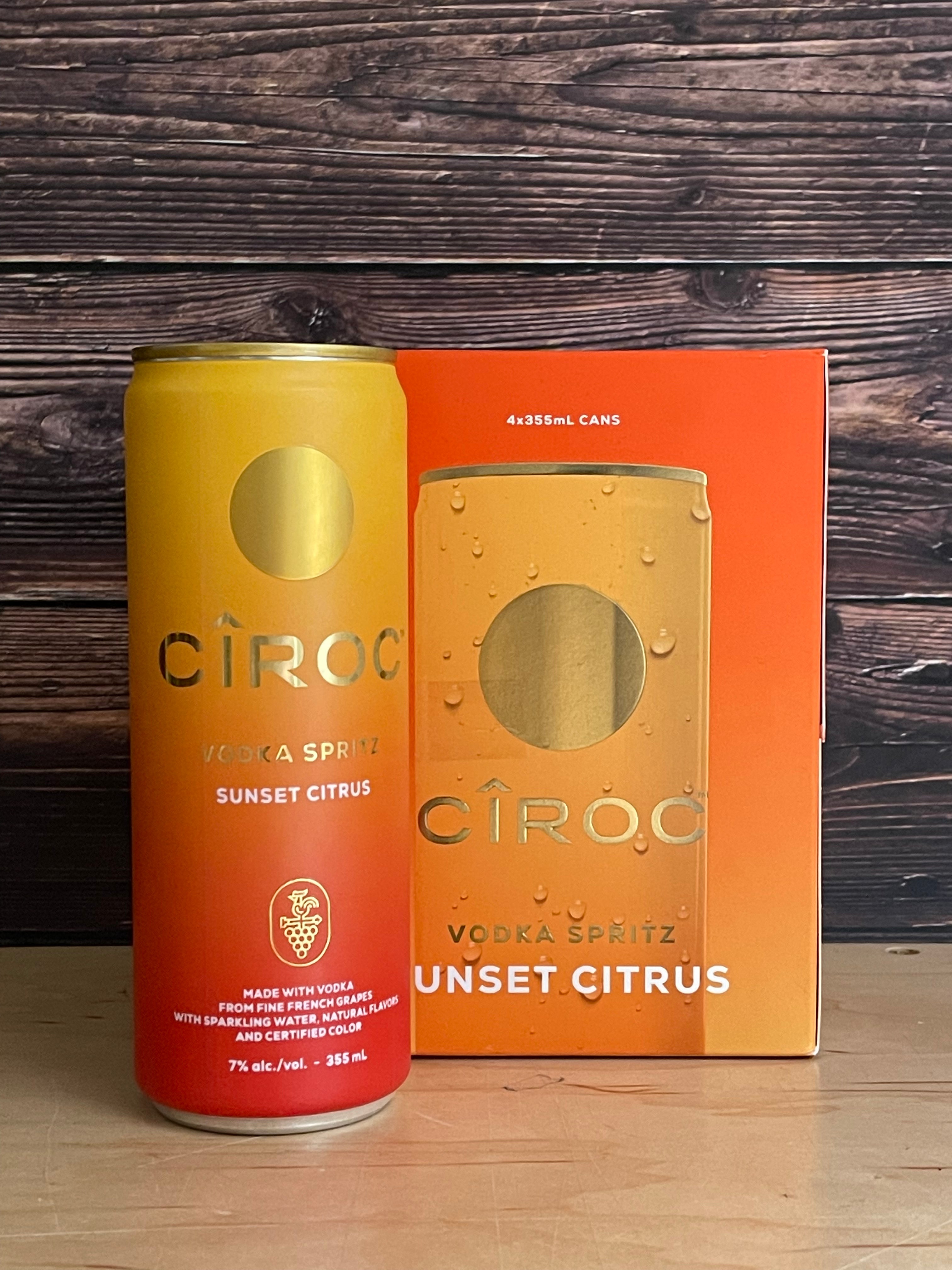 Ciroc Sunset Citrus Vodka Spritz 4PK Cans (2022 Release). Ciroc Vodka Spritz Sunset Citrus is made with vodka from fine French Grapes with sparkling water and natural flavors. Gluten-Free. 7% ABV Per Can. 355mL Cans.