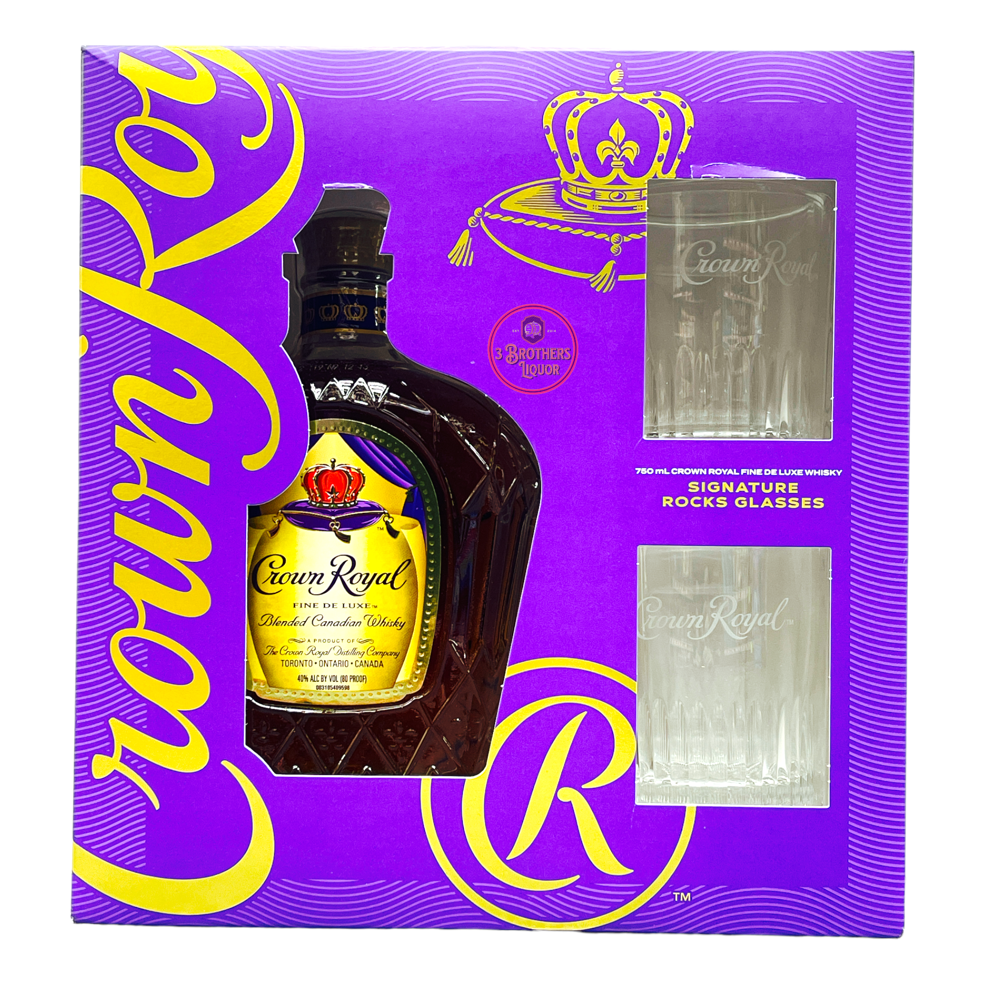 Crown Royal Fine De Luxe Whiskey Gift Set W/ 2 Signature Rock Glasses. Unwind in luxury with a premium signature rocks glass of Crown Royal Fine De Luxe Blended Canadian Whisky. Our rich, robust whisky is packaged with two premium signature rocks glasses that are perfect for any occasion.