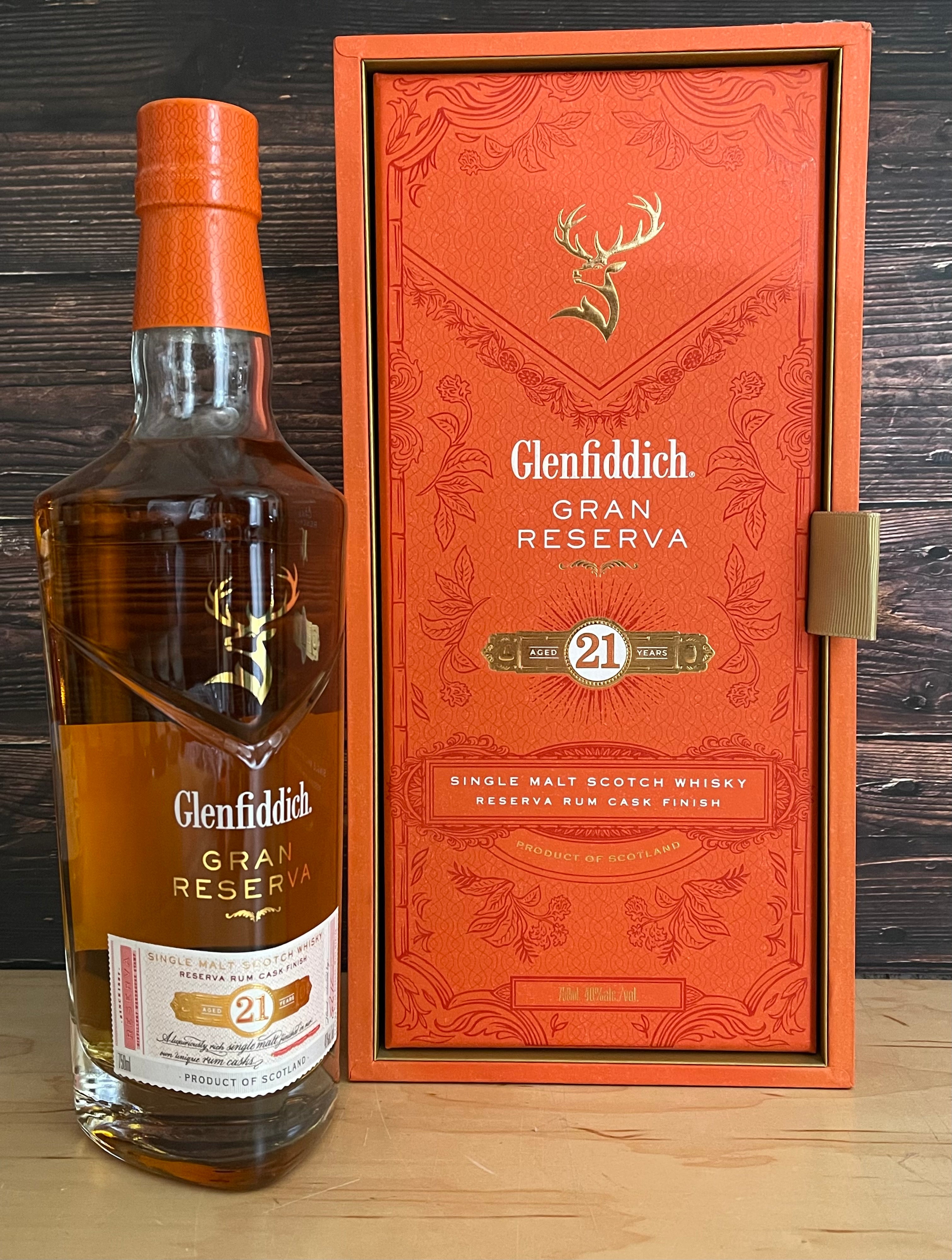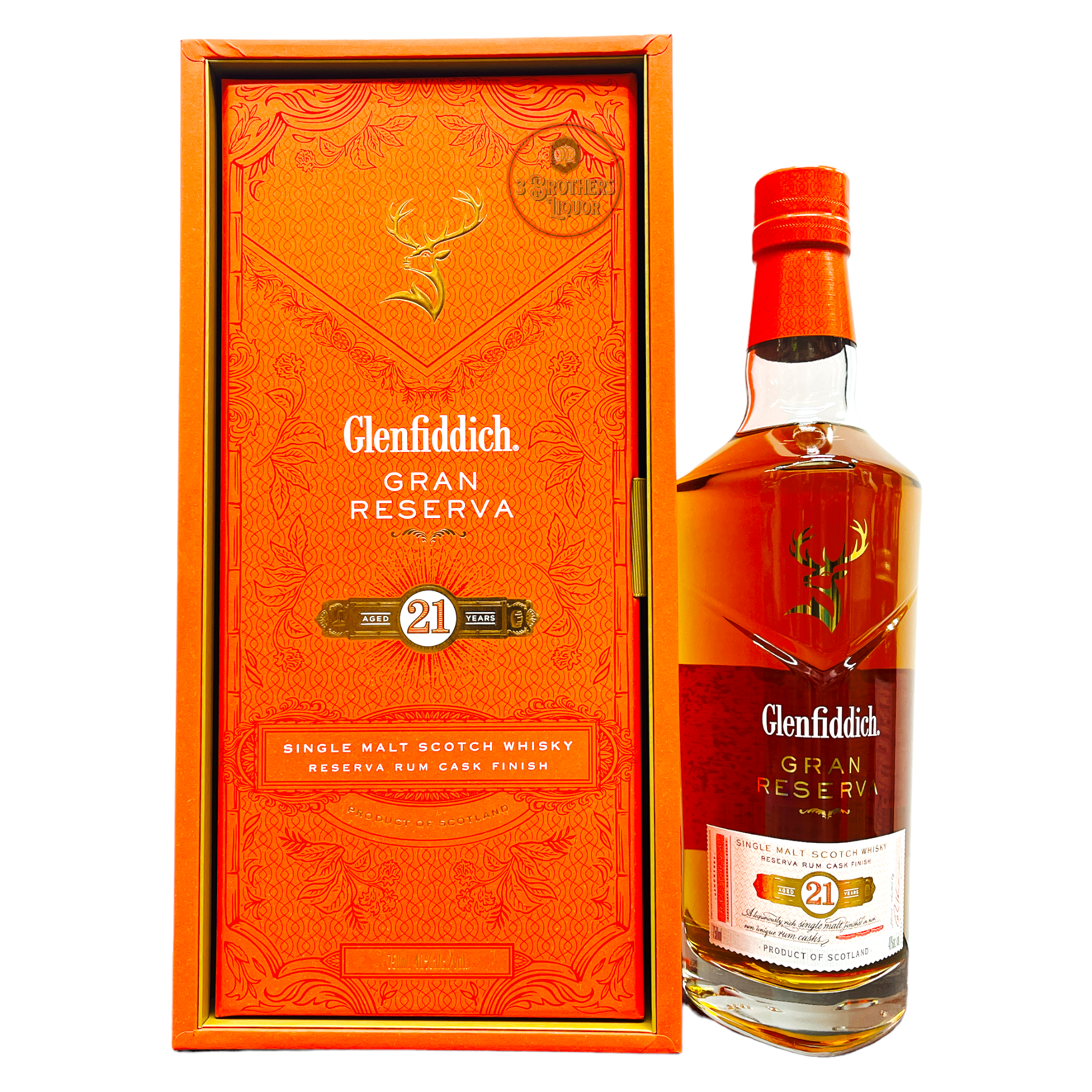Glenfiddich Gran Reserva Aged 21 Years Scotch Whisky W/ Gift Box. Patiently matured for 21 years on‐site at the distillery, it is an exquisite, traditional Speyside whisky, rich and ripe with our Glenfiddich signature notes. But rather than bottle it, as other distillers would, our Malt Master, Brian Kinsman, hand picks selected barrels and adds a sublime finishing touch.