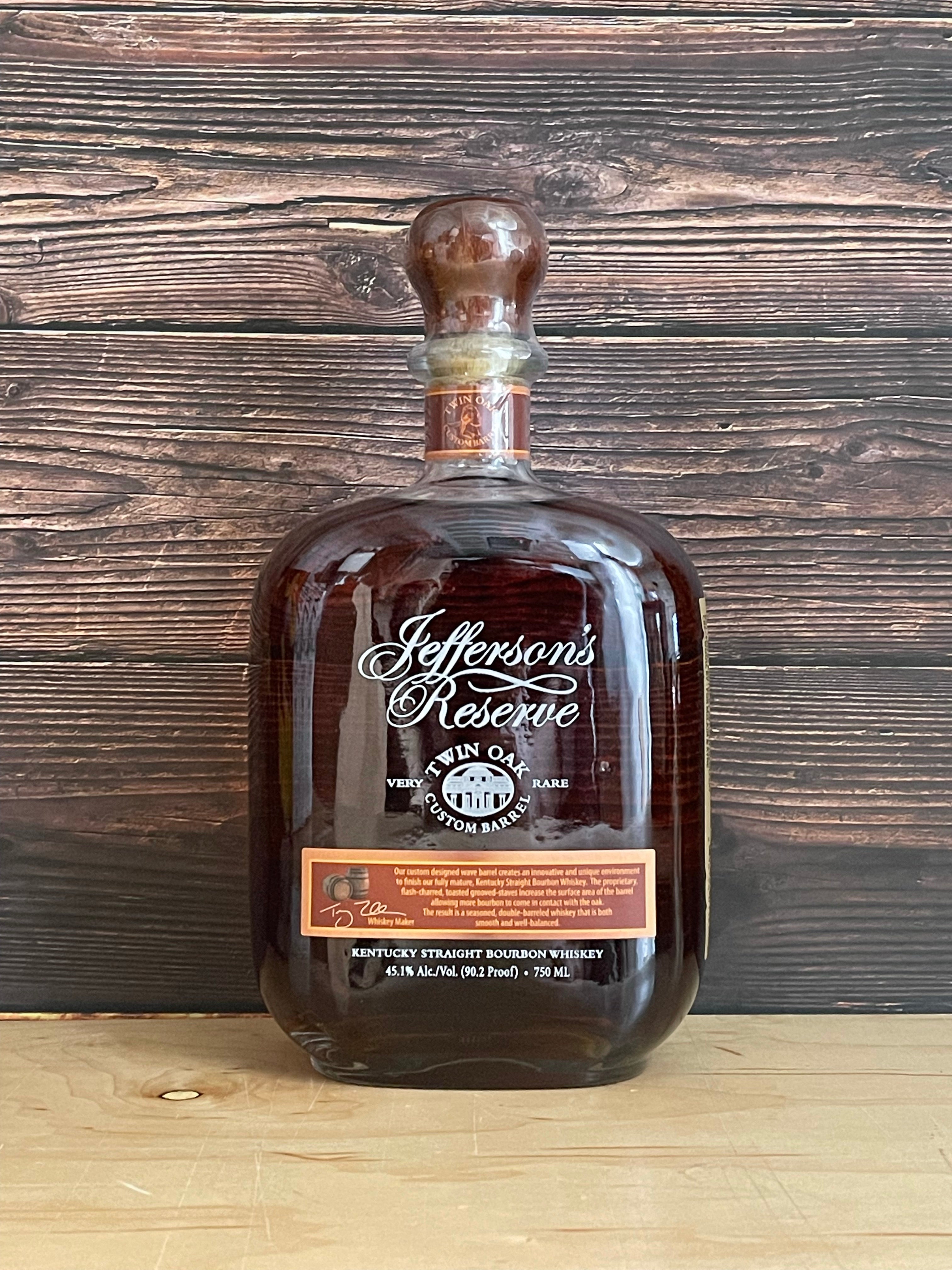 Jefferson's Reserve Twin Oak Straight Bourbon Whiskey. Another of Jefferson's unique experiments, Jefferson's Reserve Twin Oak is a blend of bourbons aged in grooved barrels designed to maximize whisky-to-wood contact.