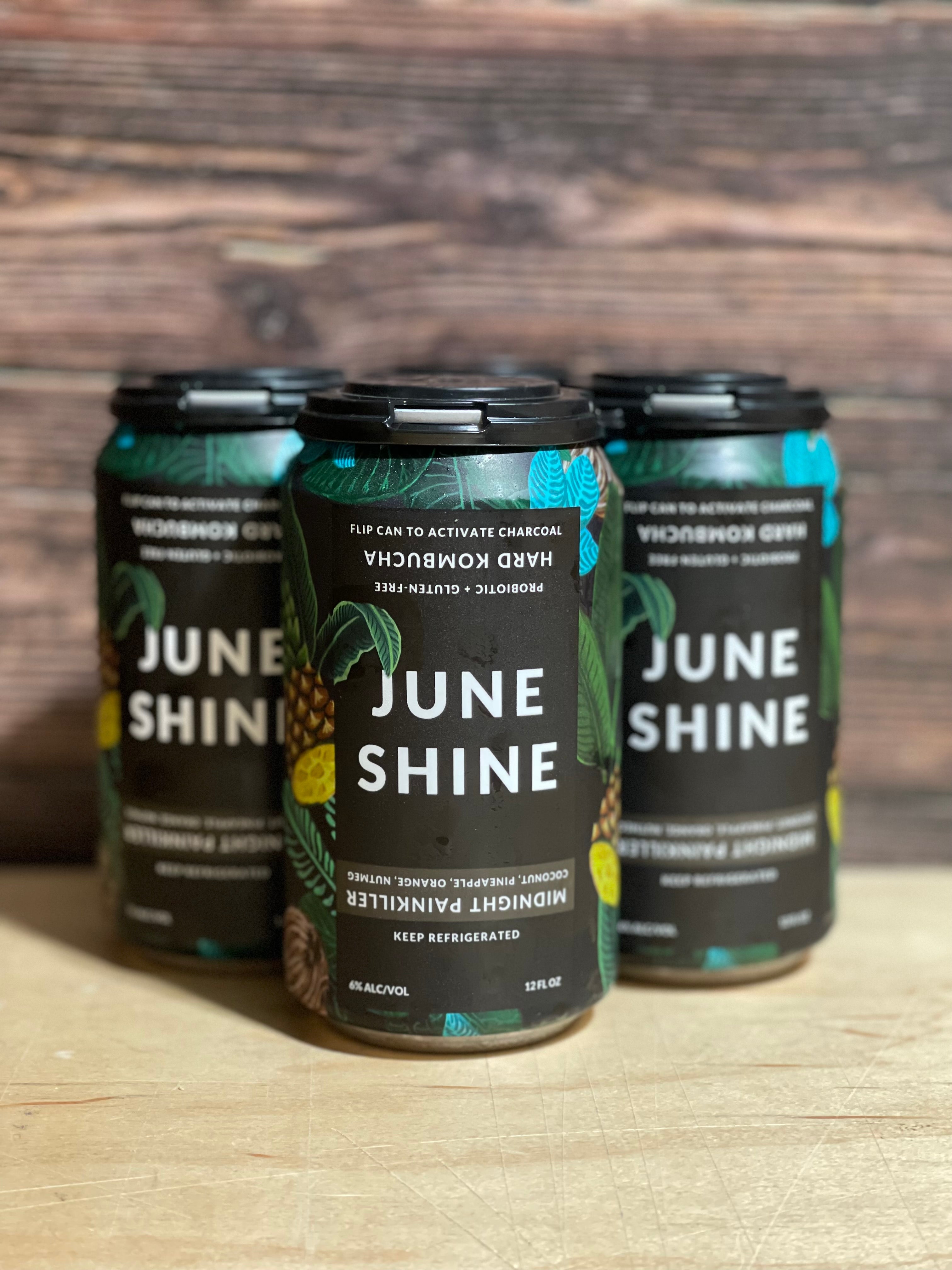 June Shine Midnight Painkiller Hard Kombucha is bold and flavorful featuring activated charcoal and a unique ½ upside down can design. Our dark twist on the classic painkiller tiki cocktail with charcoal, pineapple, coconut, orange, and nutmeg.