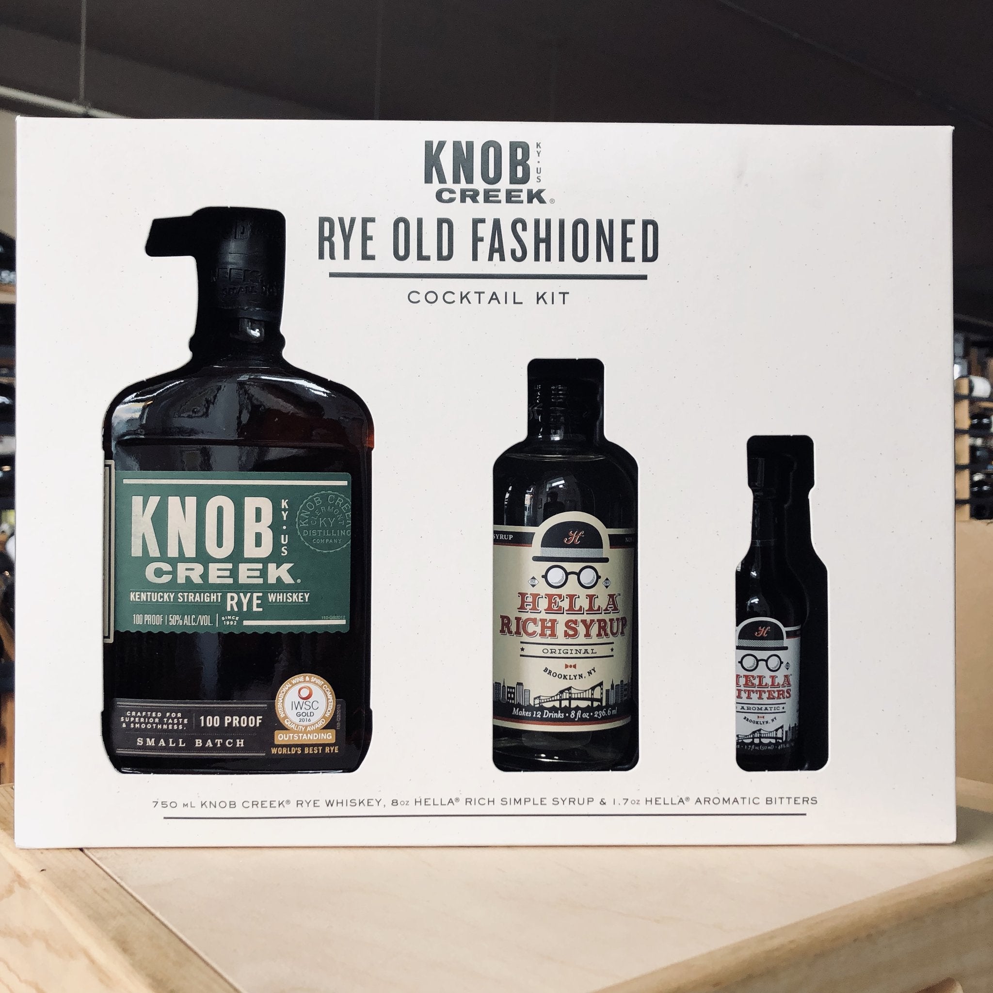 Kit includes Knob Creek Kentucky Straight Rye Whiskey 100 proof (750ML), Hella Bitters, and Hella Rich Syrup. Perfect gift for a whiskey drinker.