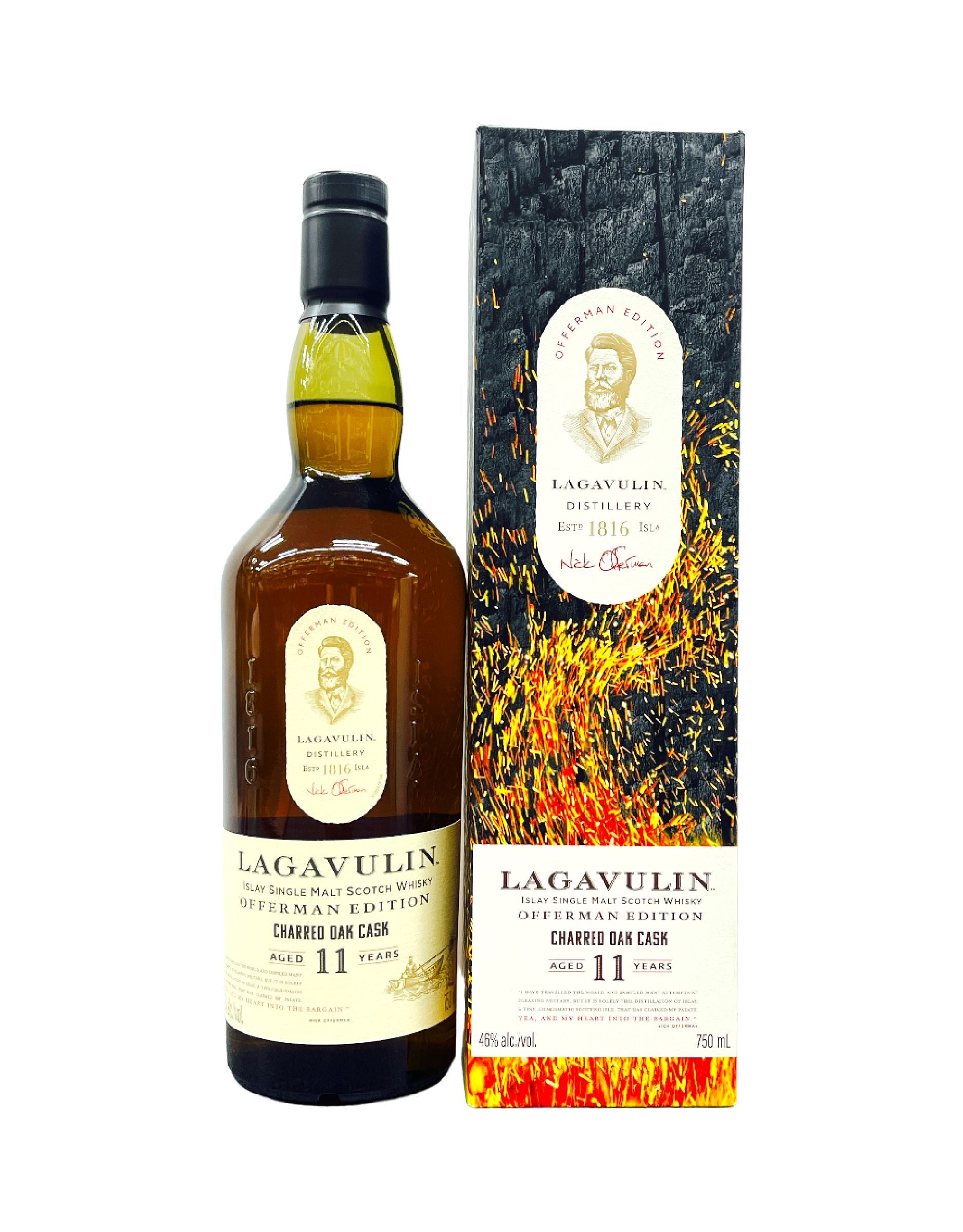 Lagavulin Aged 11 Years Charred Oak Cask Offermann Edition Scotch Whisky. Lagavulin Offerman Edition Charred Oak Cask is a single malt whisky with the perfect combination of freshly cut oak, sea salt brine and Lagavulin's signature smoke.