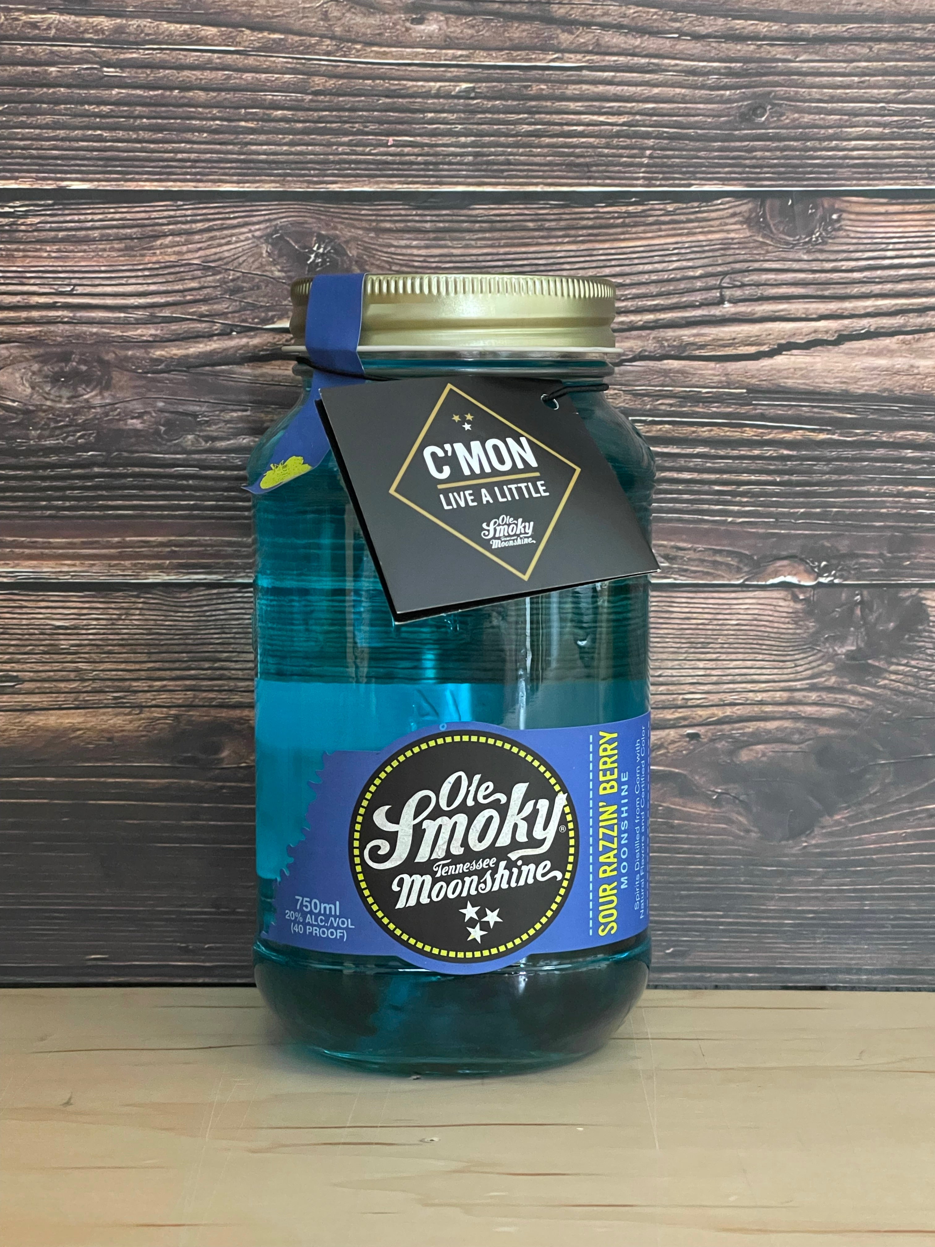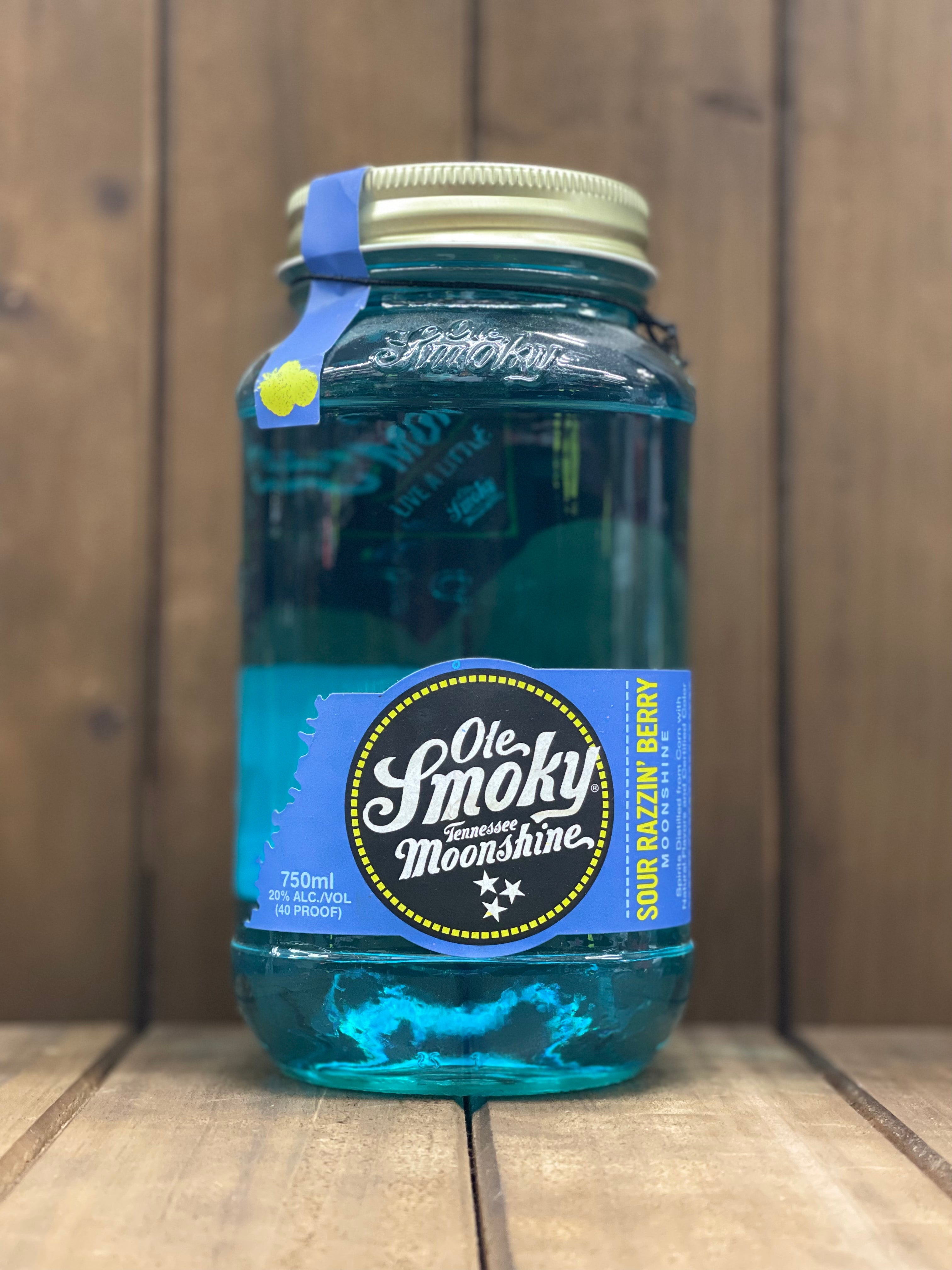 Ole Smoky Sour Razzin’ Berry Moonshine. A part of their lower-proofed flavored moonshine lineup, this jar packs a sweet & sour punch with blue raspberries and a distinct sourness.
