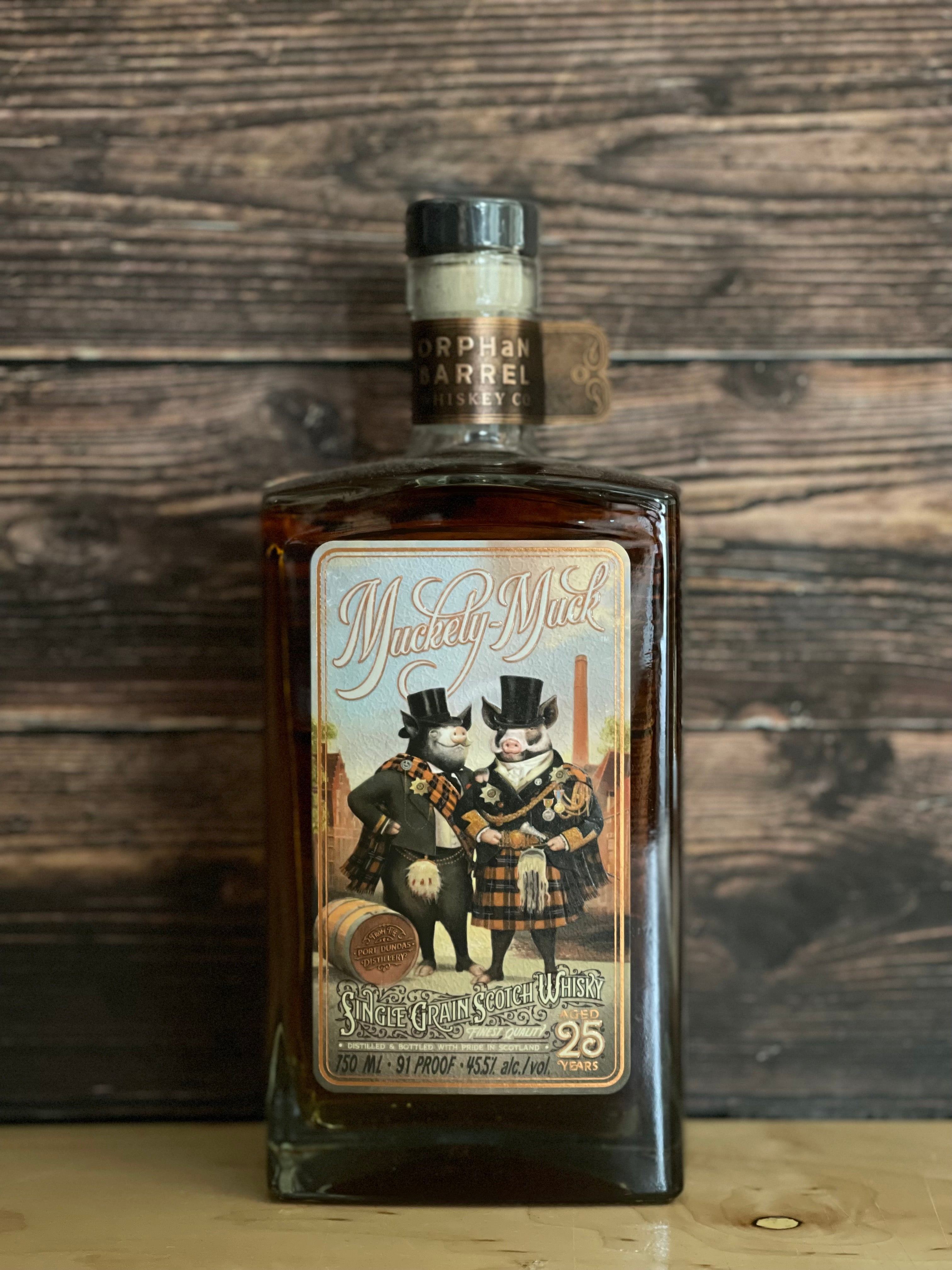 Orphan Barrel Muckety Much 25yr Single Grain Scotch Whiskey. The Orphan Barrel Whisky Distilling Co. released Muckety-Muck 25 Year Old, a limited edition, Single Grain Scotch Whisky from the now-ghost Port Dundas distillery.