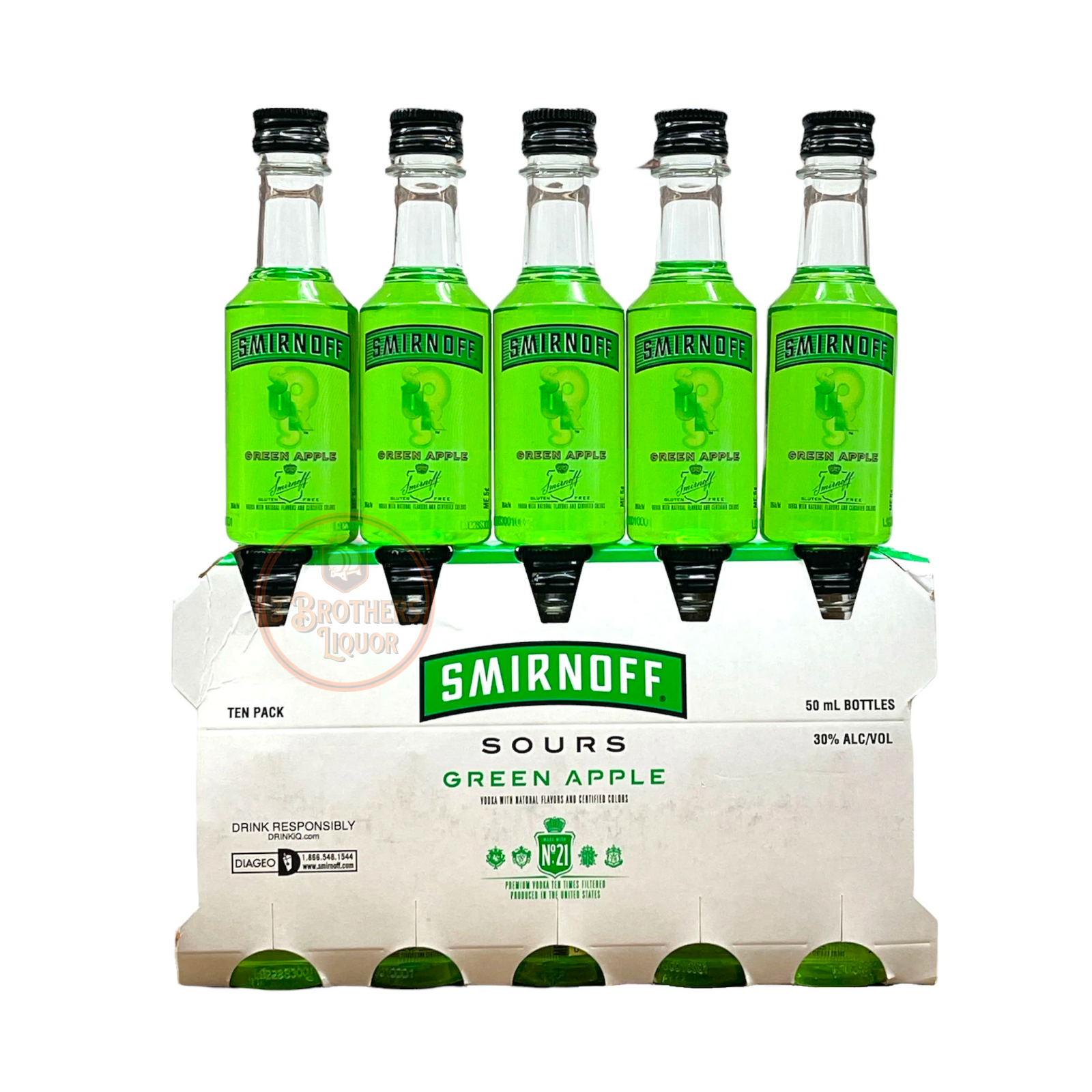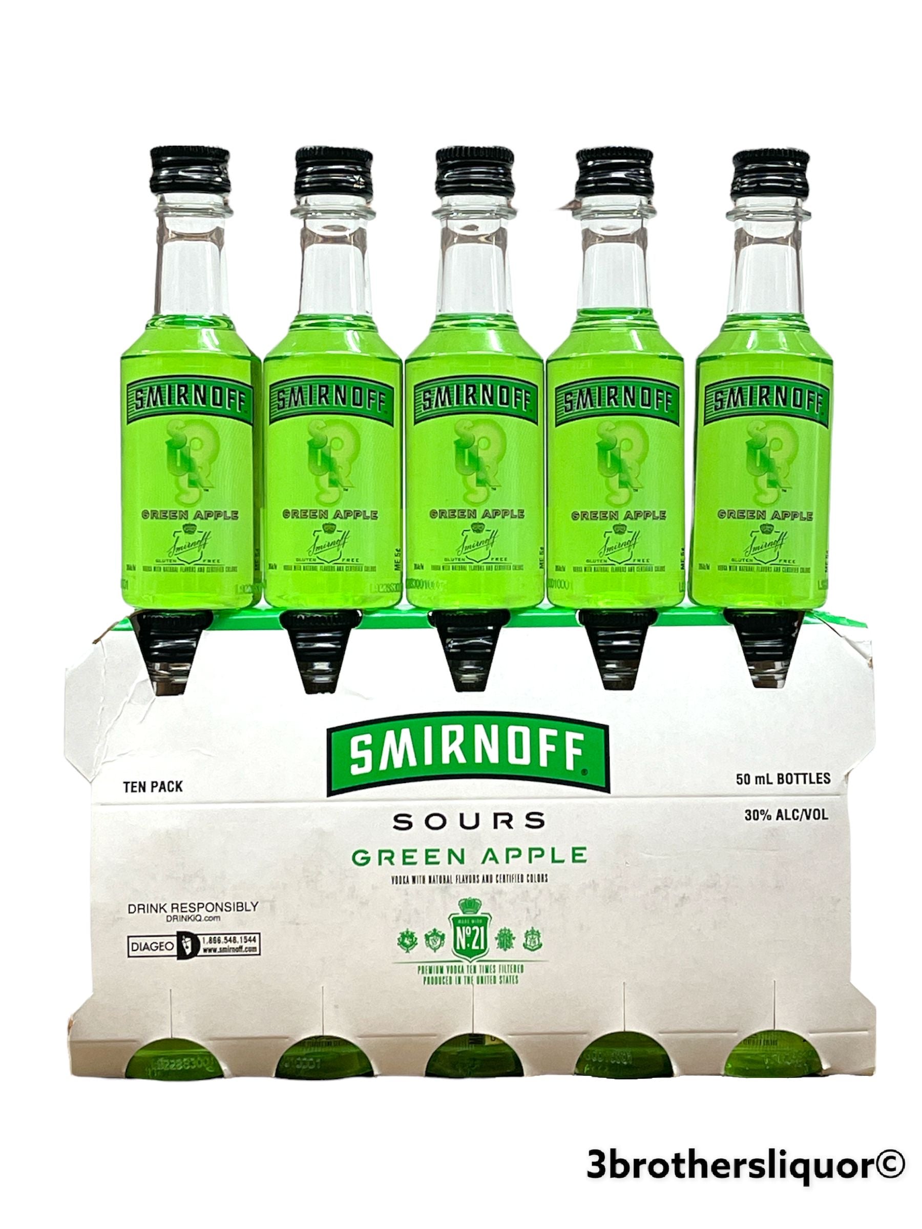 Smirnoff Sours Green Apple Vodka Mini Shots (10 Pack Of 50ML). Smirnoff Sours Green Apple is infused with the crisp and tart flavor of green apples, for a sour but sweet taste. Served best as a chilled shot. Smirnoff Sours Green Apple is Kosher Certified and gluten free.