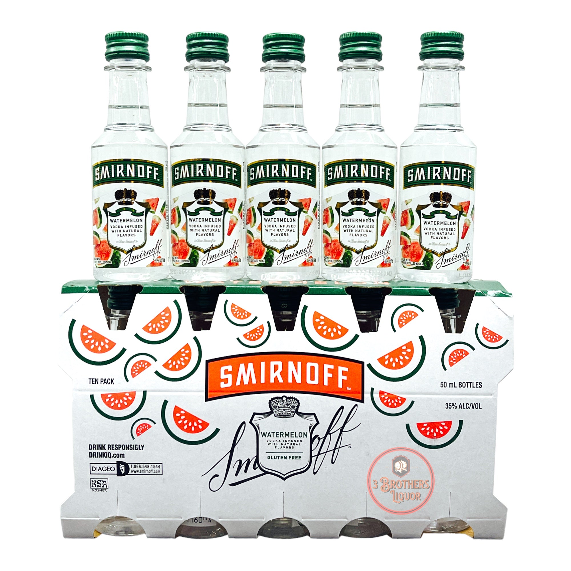 Smirnoff Watermelon Flavored Vodka Mini Shots (10 Of 50ML). Smirnoff Watermelon Flavored Vodka is a premium vodka that offers a refreshing and juicy taste of summer. Made with the finest ingredients and triple distilled for a smooth and clean taste, this vodka is infused with the natural flavor of ripe watermelons, creating a deliciously sweet and fruity taste.