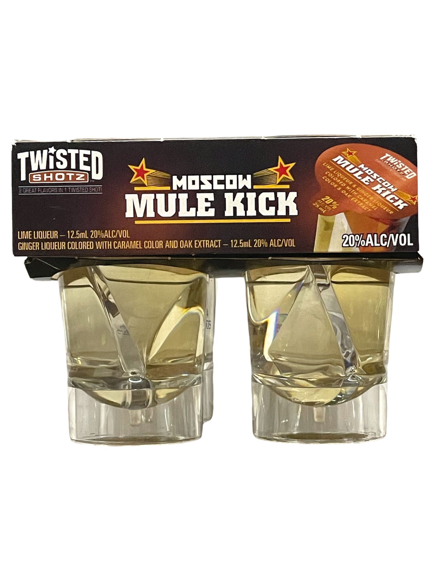 Twisted Shotz Moscow Mule Kick Half And Half Shots (25ML x 4 Pack). It's time to get kicked! Moscow Mule Kick is a smooth and spicy twist on the classic Moscow Mule cocktail in this new slightly sweet, travel-ready shot. No copper mug needed