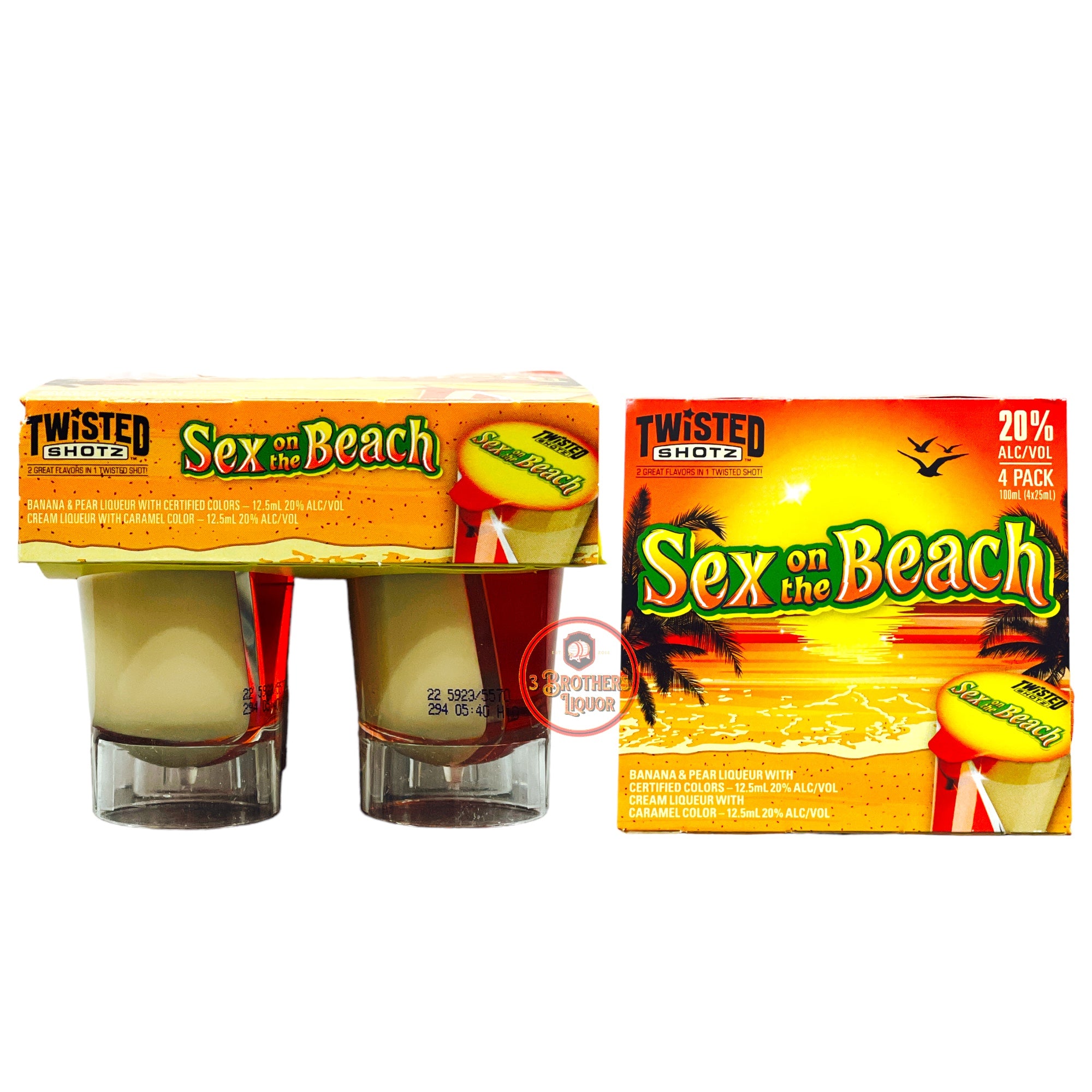 Twisted Shotz Sex On The Beach Flavoured 4Pk Mixed Shots RTD. A pear and banana blend with a cream liqueur twist, this Twisted Shot will transport you to a tropical destination. BRAND. Twisted Shotz. COUNTRY. United States.
